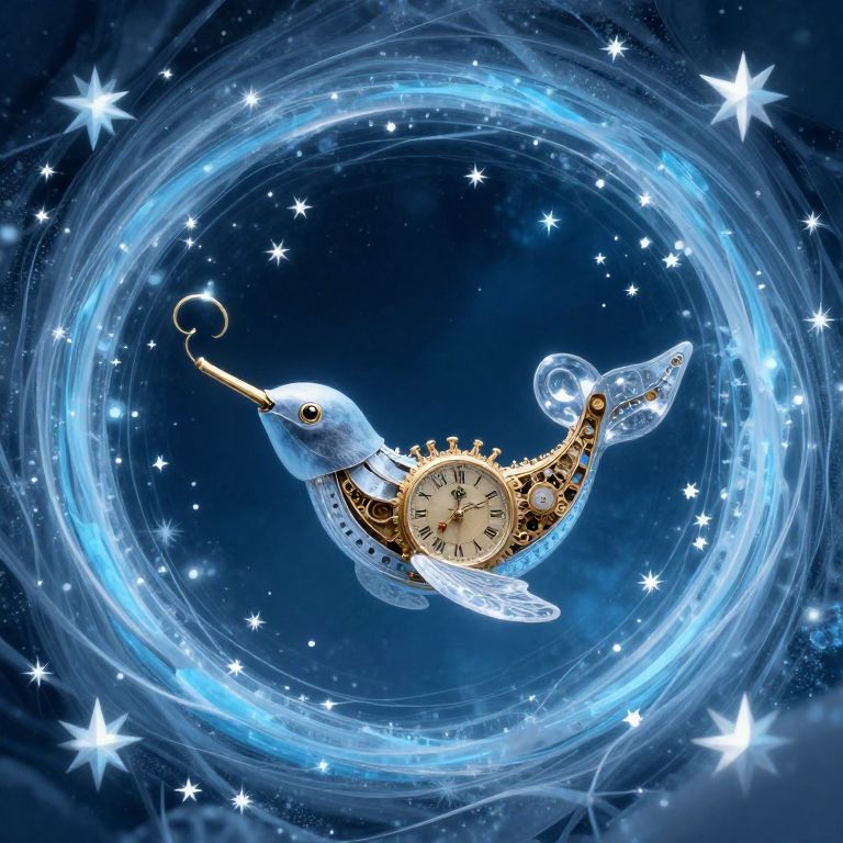 A clockwork whale swims through a tunnel of frozen stars, its song resonating in harmonic frequencies that unravel the fabric of nearby geometric skies.