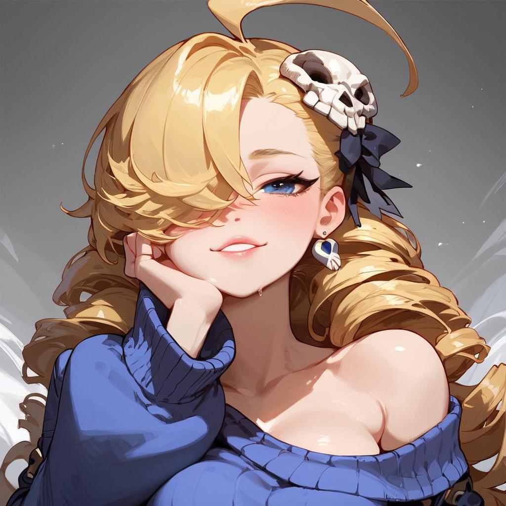 Score_9, score_8_up, score_7_up, source_anime, solo, 1girl, zone-tan, seductive smile, looking at viewer, hand on own cheek, hair over one eye, ahoge, drill hair, skull hair ornament, off-shoulder sweater, thighhighs