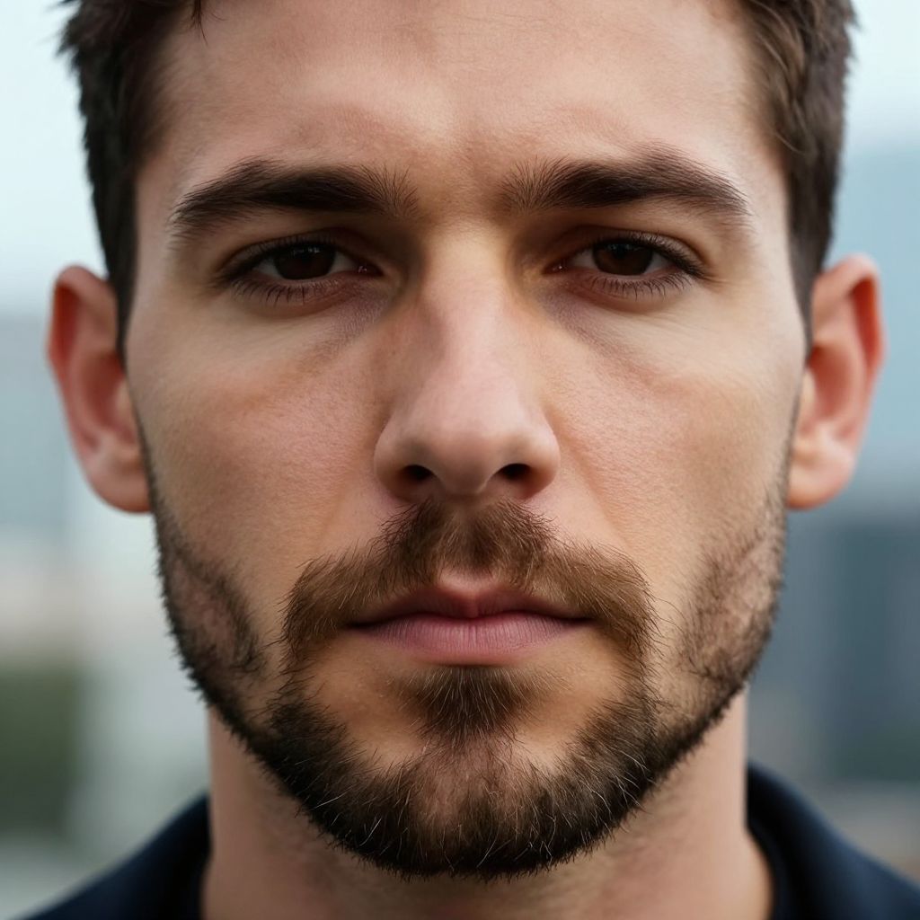 Chin beard no mustache style on a rugged man, detailed facial hair with sharp clean edges, expressive eyes, subtle skin texture, natural lighting highlighting beard strands, close-up portrait, modern urban background, realistic and cinematic.