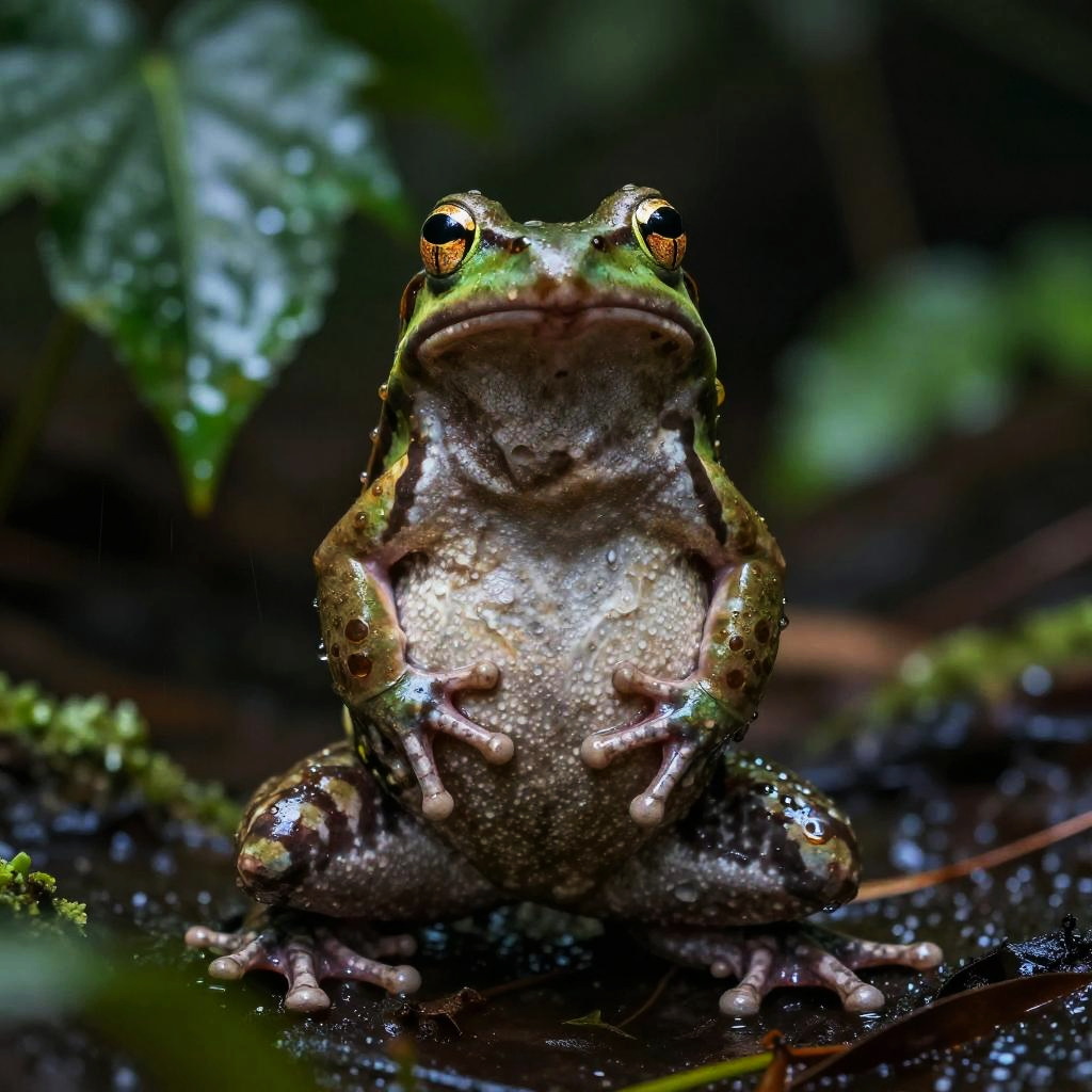 Real frog standing up on hind legs in a rainy jungle setting, water droplets on skin, dark vibrant foliage background, moody atmospheric lighting, ultra detailed amphibian portrait