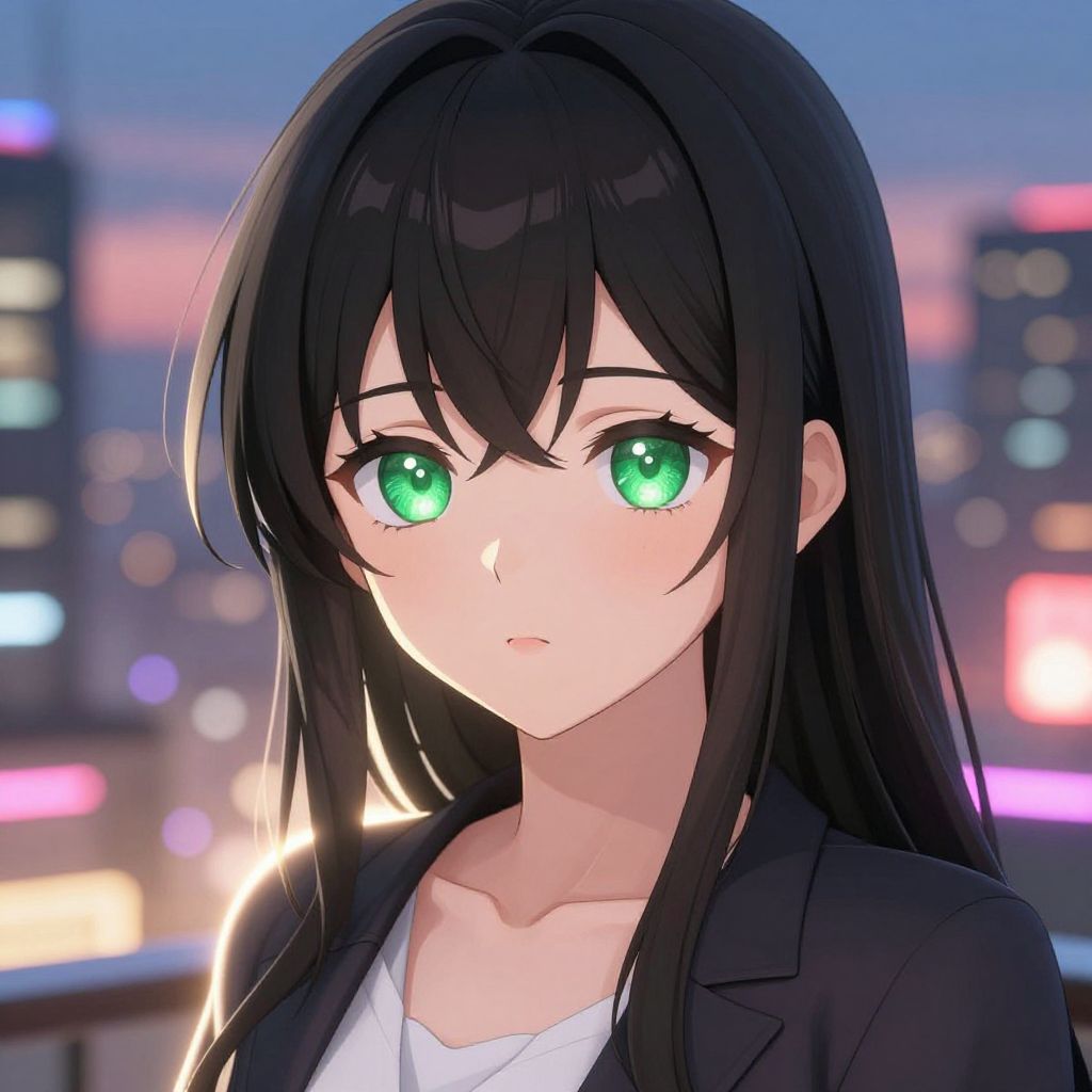 Pretty realistic anime girl with shimmering emerald eyes and silky dark hair, subtle blush on cheeks, dressed in modern elegant attire, surrounded by a soft glowing aura, background of vibrant cityscape at dusk with neon lights reflecting, detailed anime style portrait
