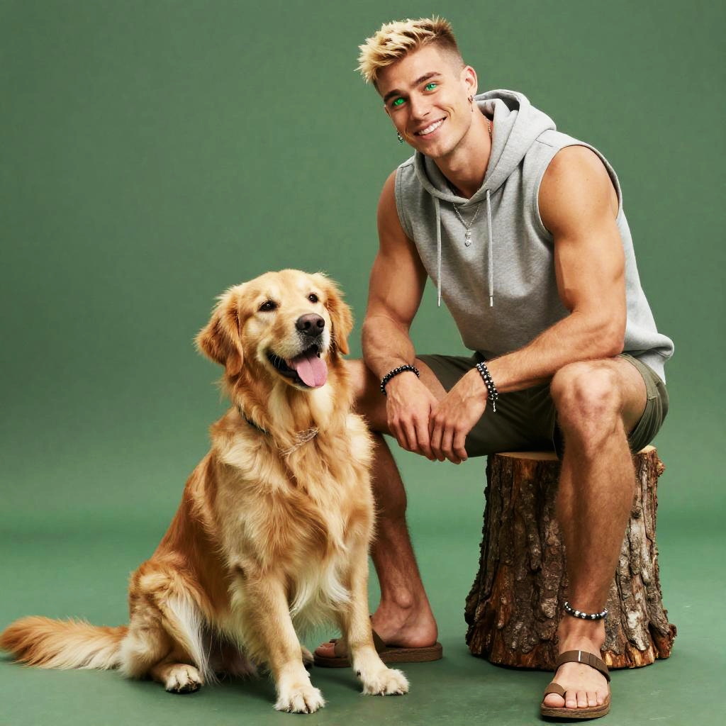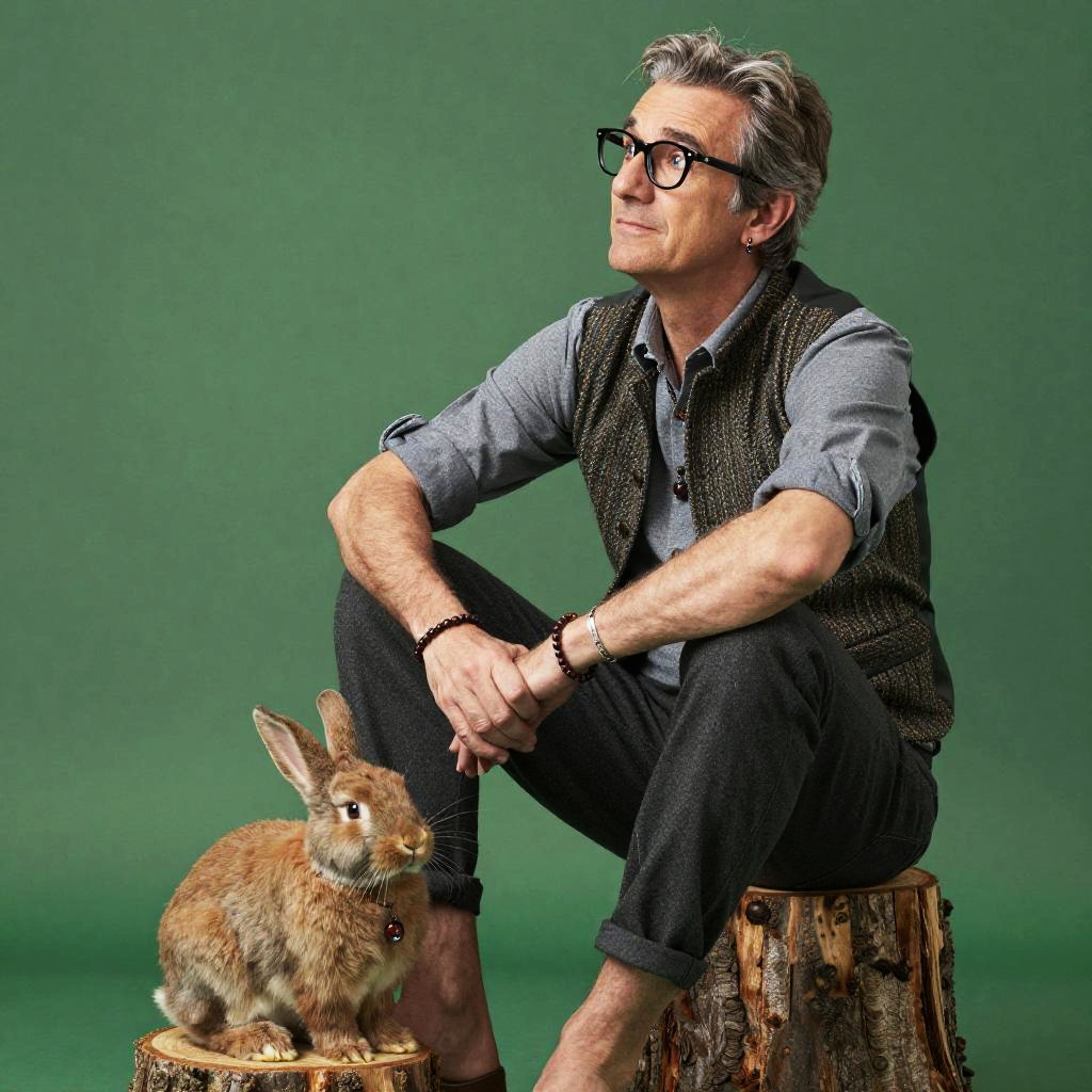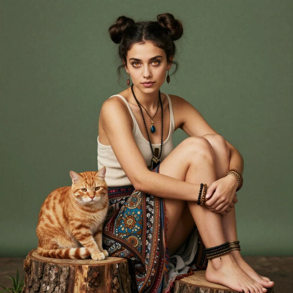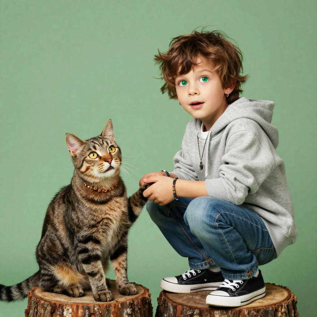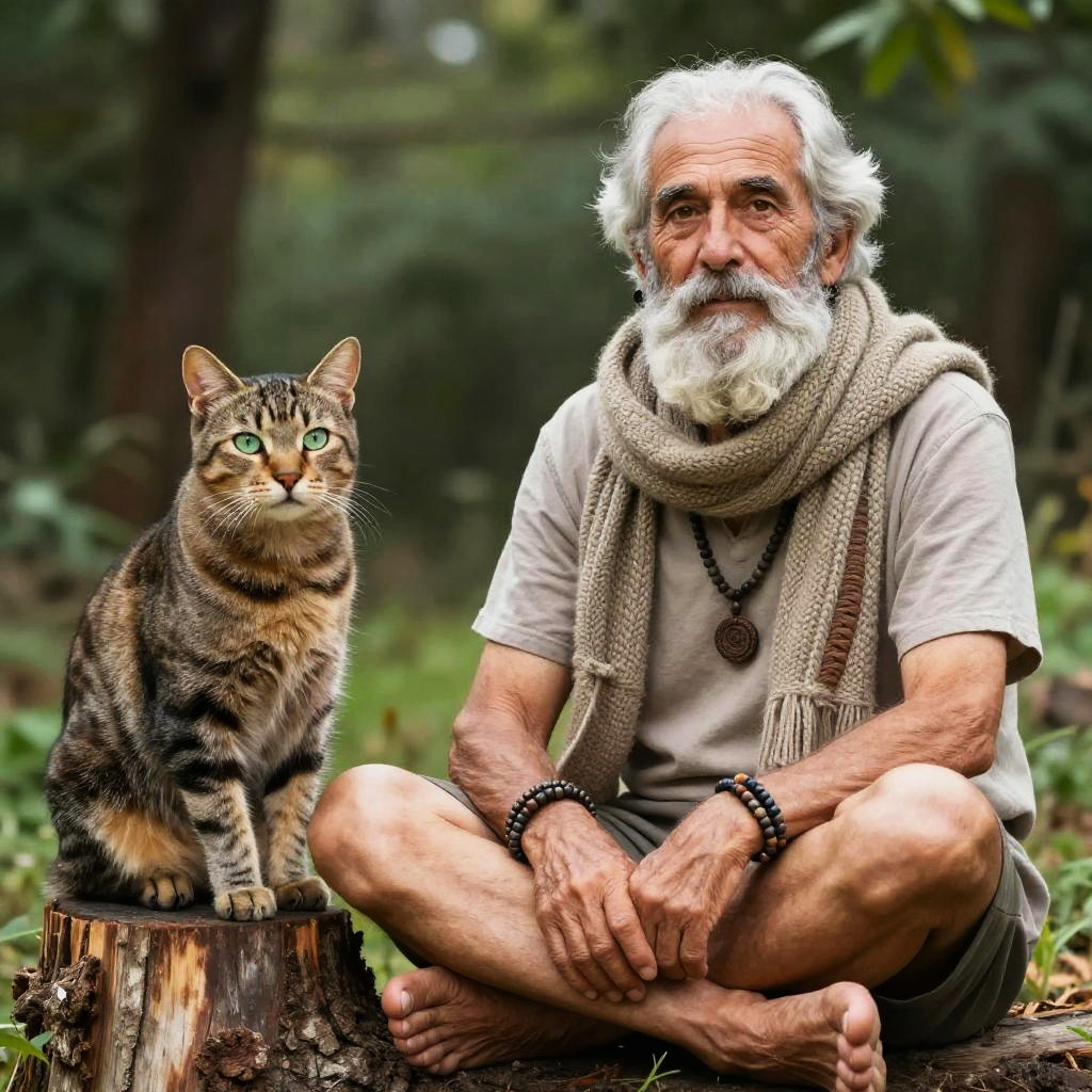 Full body, elderly man with flowing snowy beard and wise hazel eyes adorned in woolen scarf, majestic tabby cat with emerald eyes perched beside, holding hands, sitting on a tree stump, anklet, necklace, earrings, bracelet, armlet, relaxed seated posture, serene contentment, green background