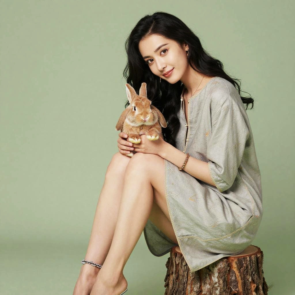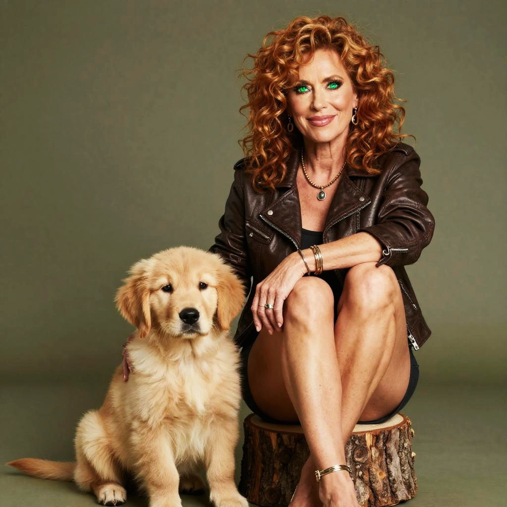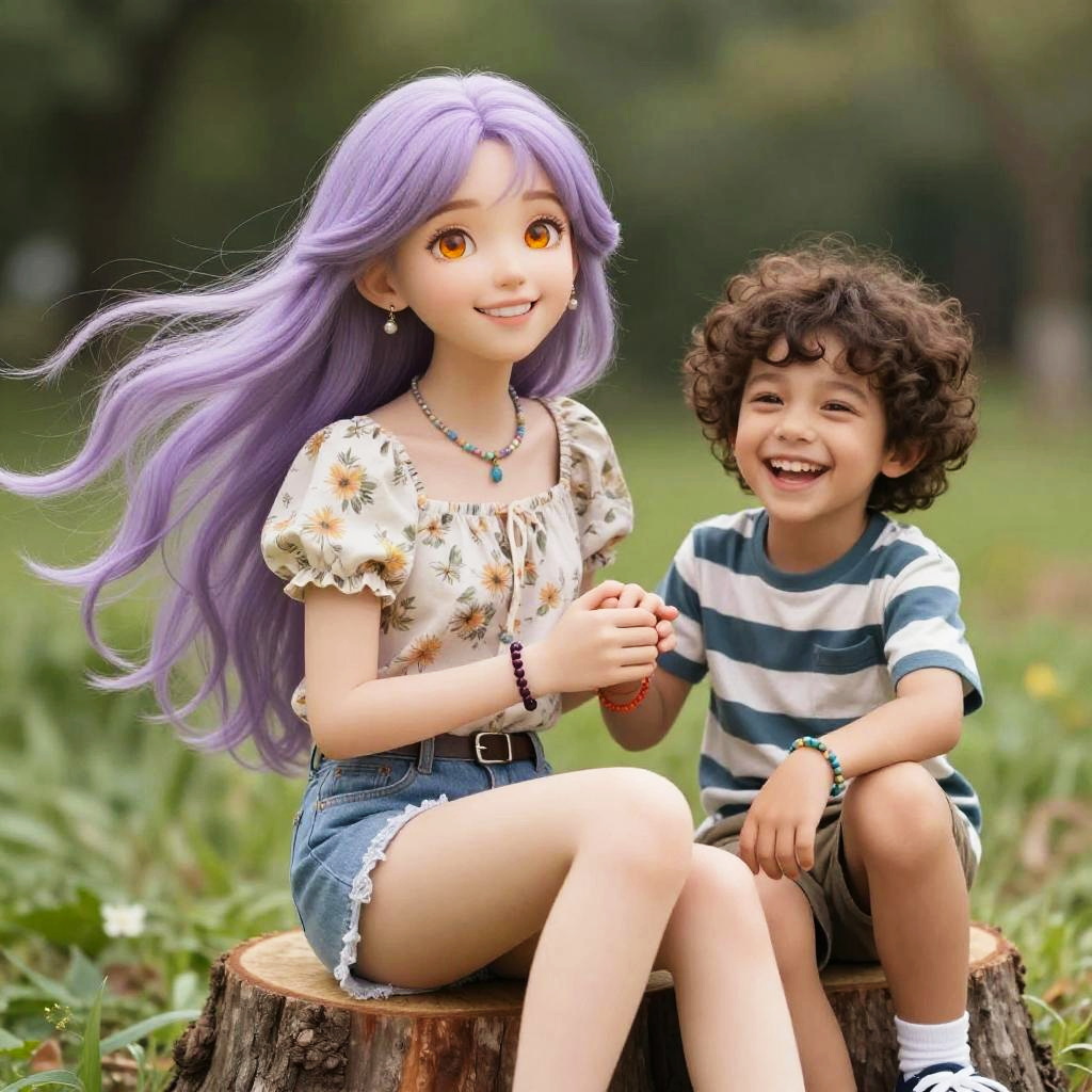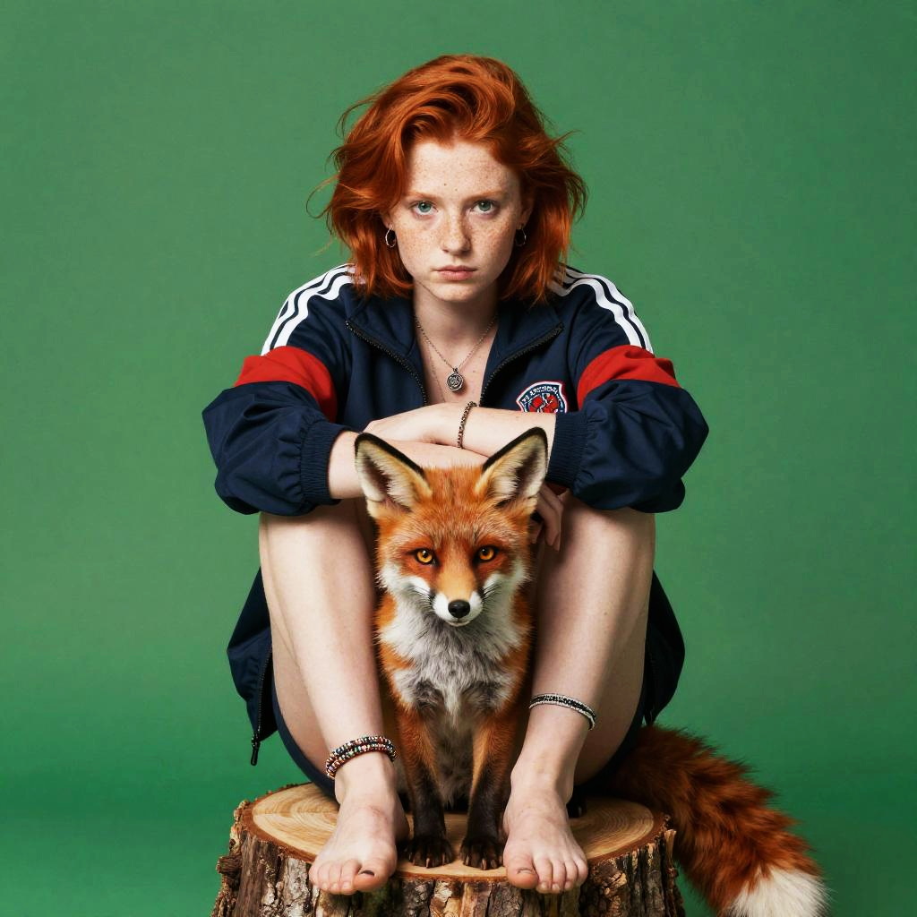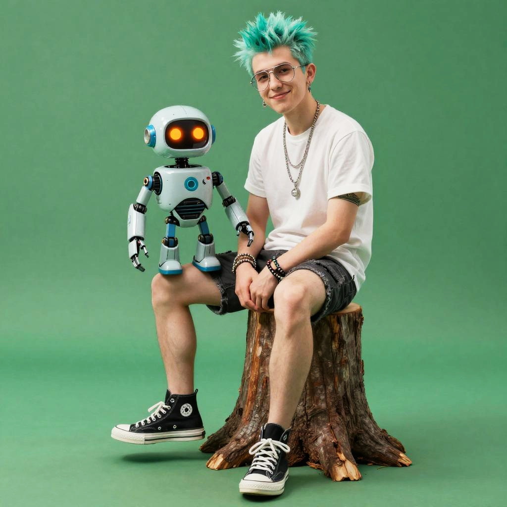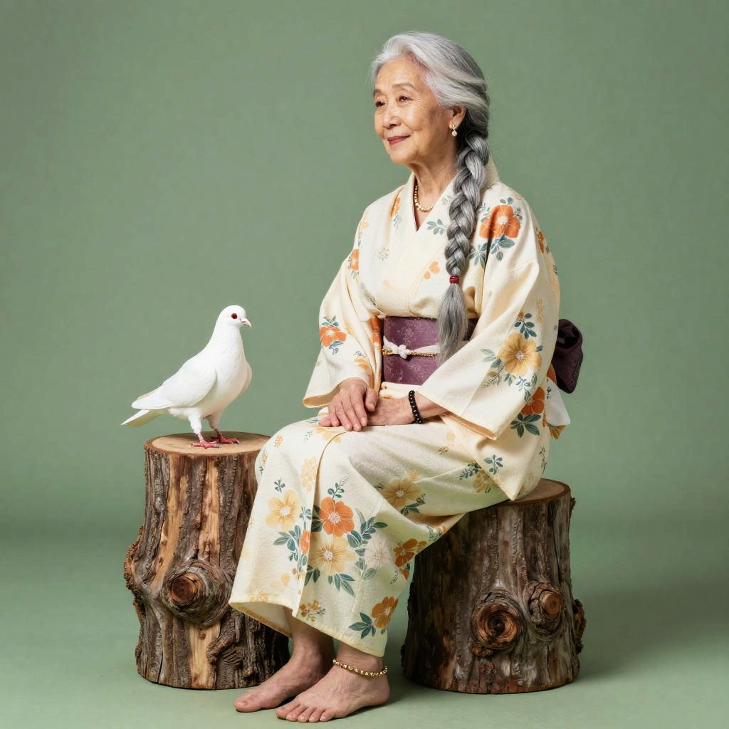 Full body, elderly man with flowing snowy beard and wise hazel eyes adorned in woolen scarf, majestic tabby cat with emerald eyes perched beside, holding hands, sitting on a tree stump, anklet, necklace, earrings, bracelet, armlet, relaxed seated posture, serene contentment, green background