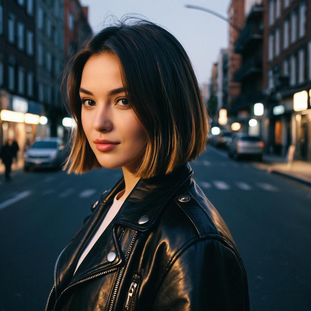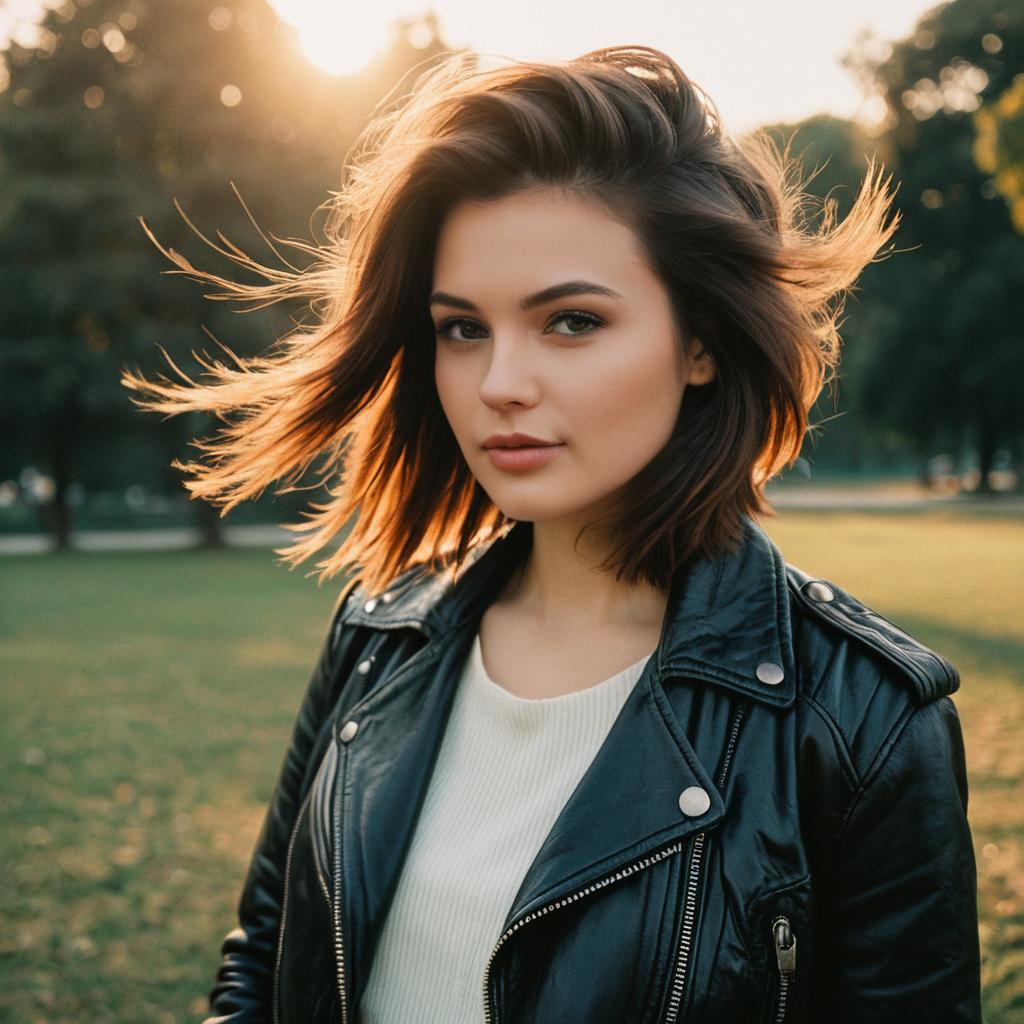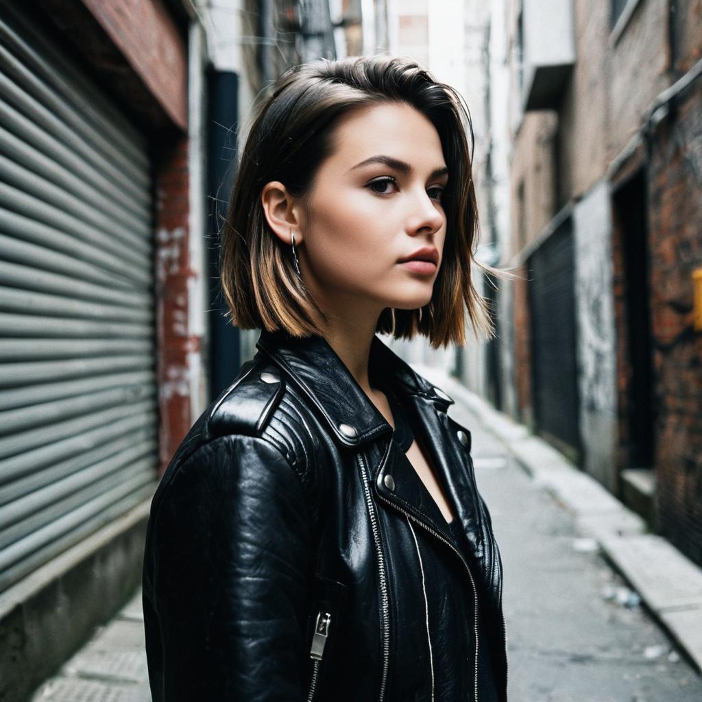 Portrait of a young woman with a middle part hairstyle wearing a black edgy leather jacket. She is standing in an urban street setting during golden hour, styled in a fashion editorial look with soft warm lighting highlighting her features.