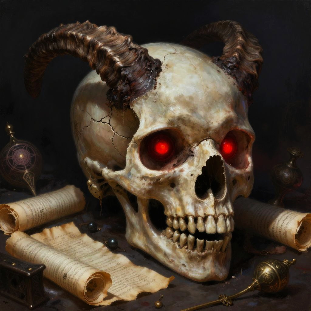 Photograph of a detailed, realistic skull with glowing orange candles on either side, set against a dark, smoky background.