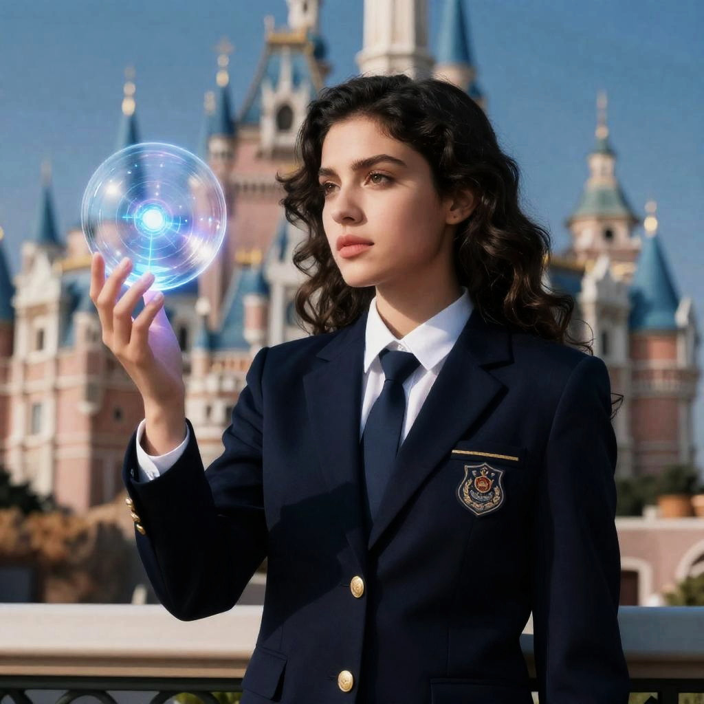 RAW photo of beautiful latino woman, school blazer jacket, tie, collared shirt, magic orbs, castle, fantasy, highly detailed, realistic