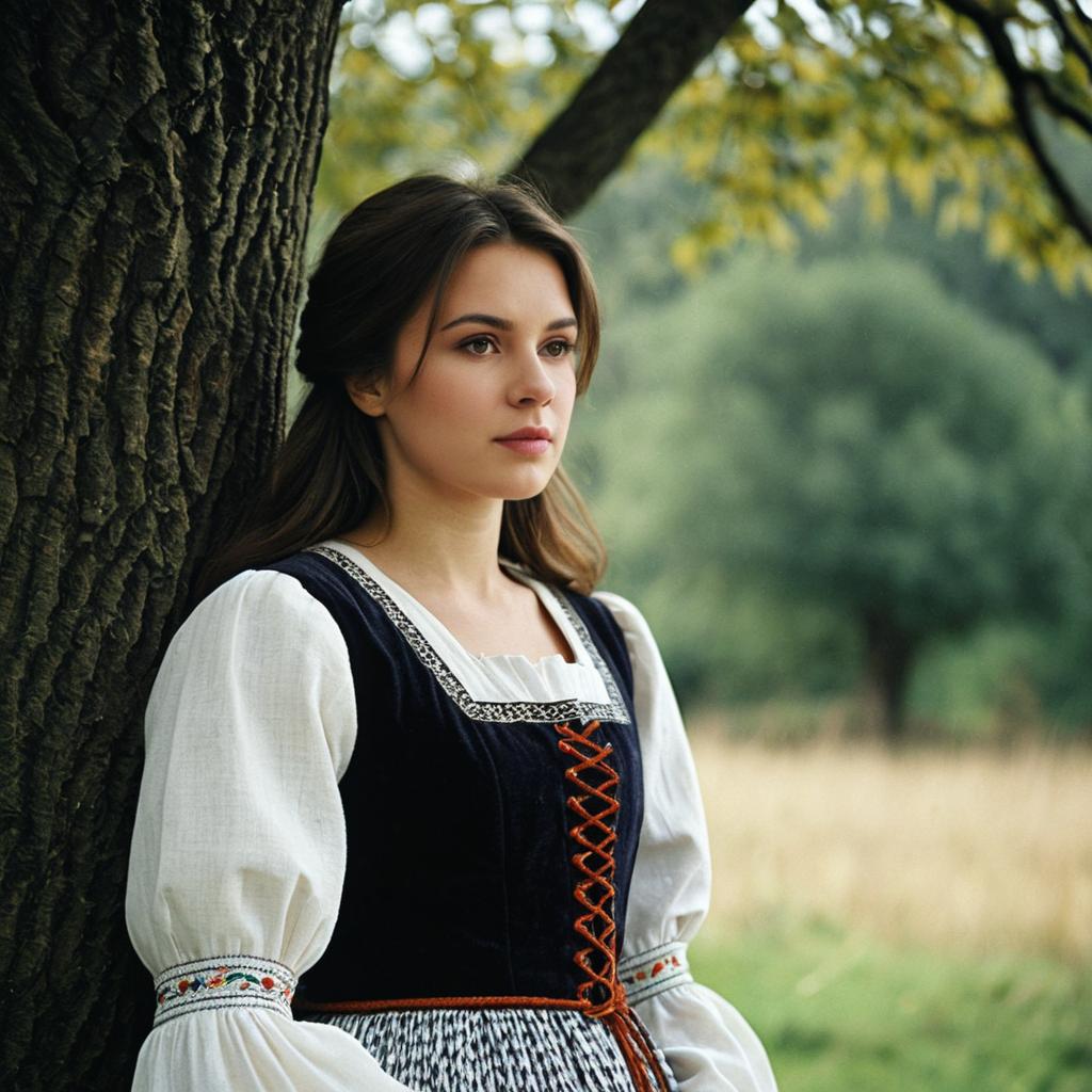 Medieval peasant fancy dress,1girl, solo, braid, twin braids, looking at viewer, long sleeves, long hair, realistic, black hair, outdoors, standing, closed mouth, dress, hat, skirt