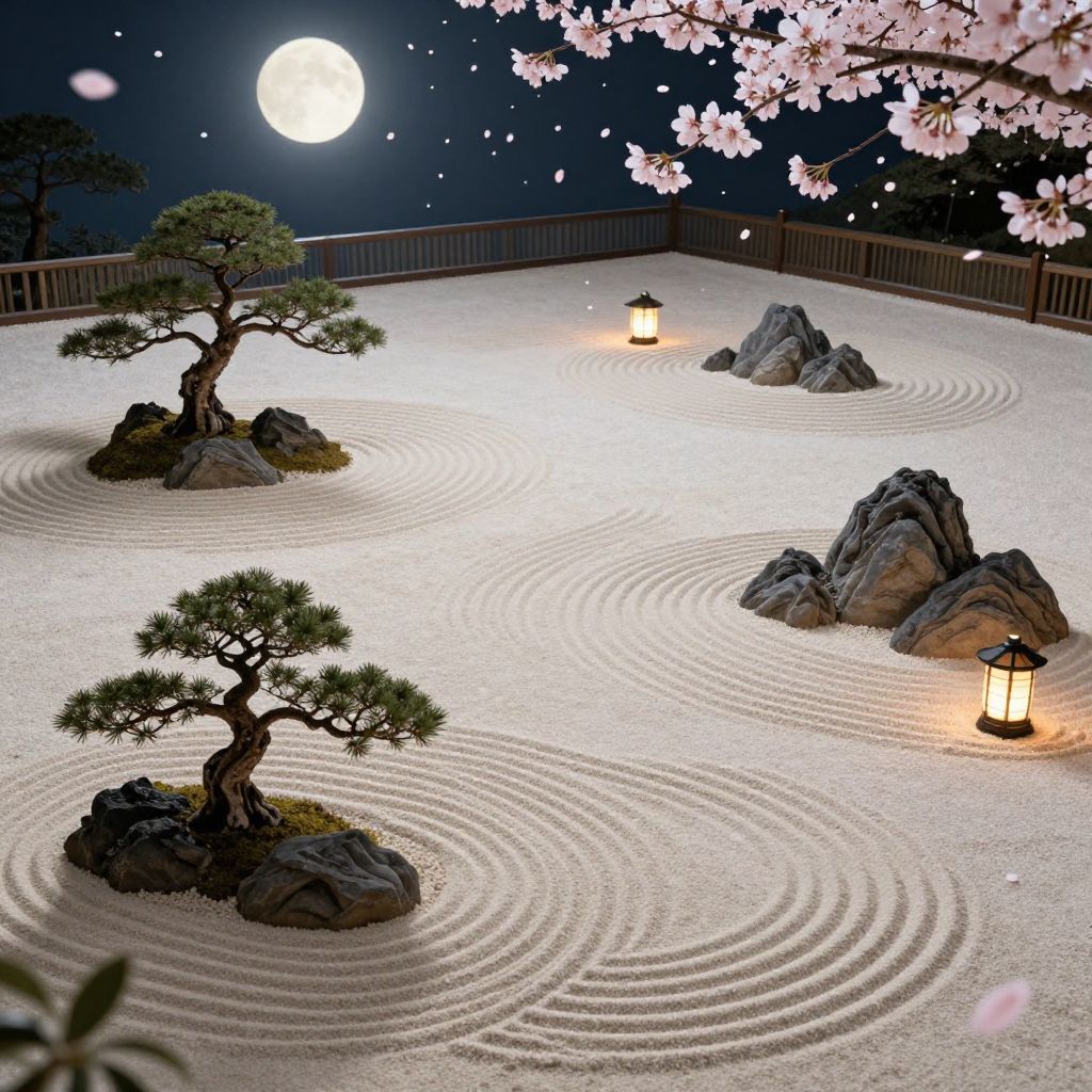 Nighttime Japanese Zen garden with raked sand, three bonsai trees, rocky formations, lanterns, cherry blossoms, and a full moon in