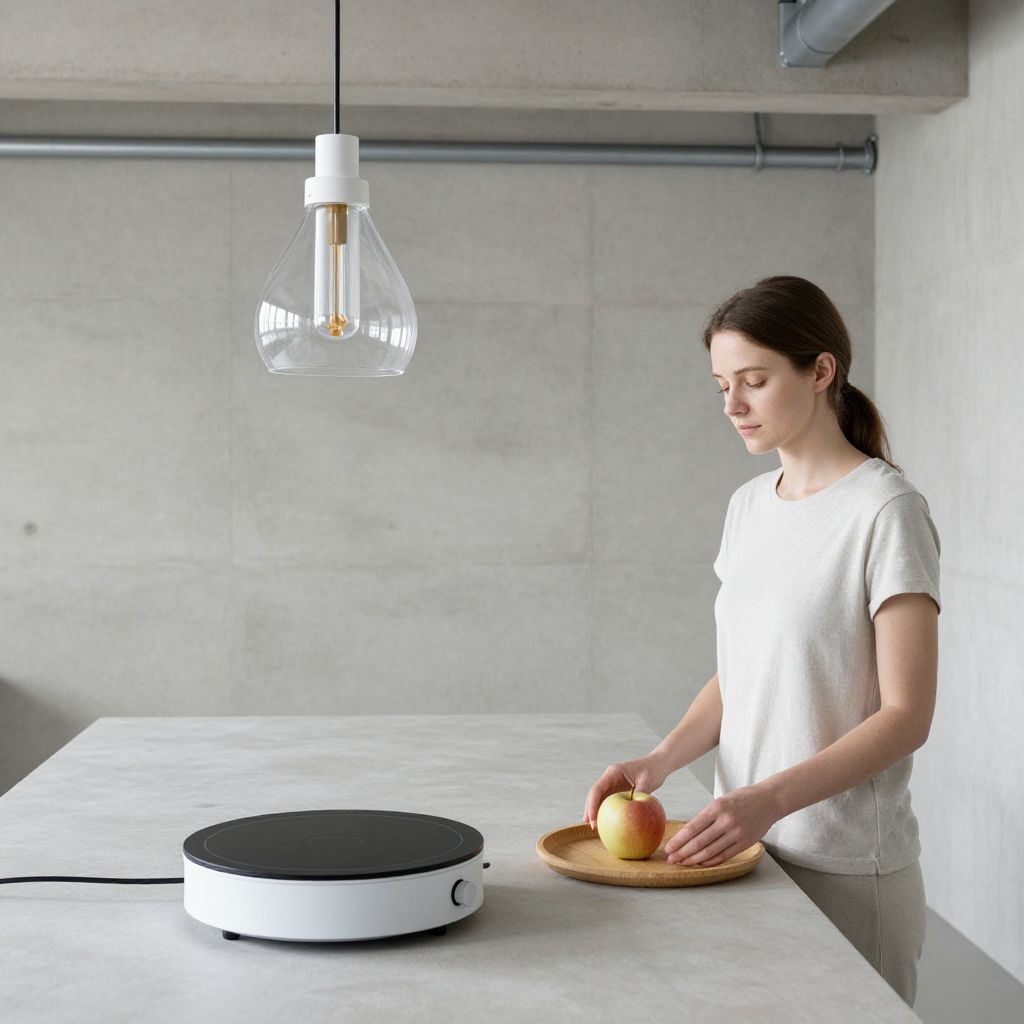 An ultra-minimalist kitchen with only one appliance — a small, rounded induction stove — and a single pendant light made of clear glass. A woman with warm amber eyes and a quiet, serene expression is placing a fresh apple on a bamboo tray. The space features open concrete walls, exposed pipes, and a clean floor with no clutter, emphasizing simplicity and functionality.