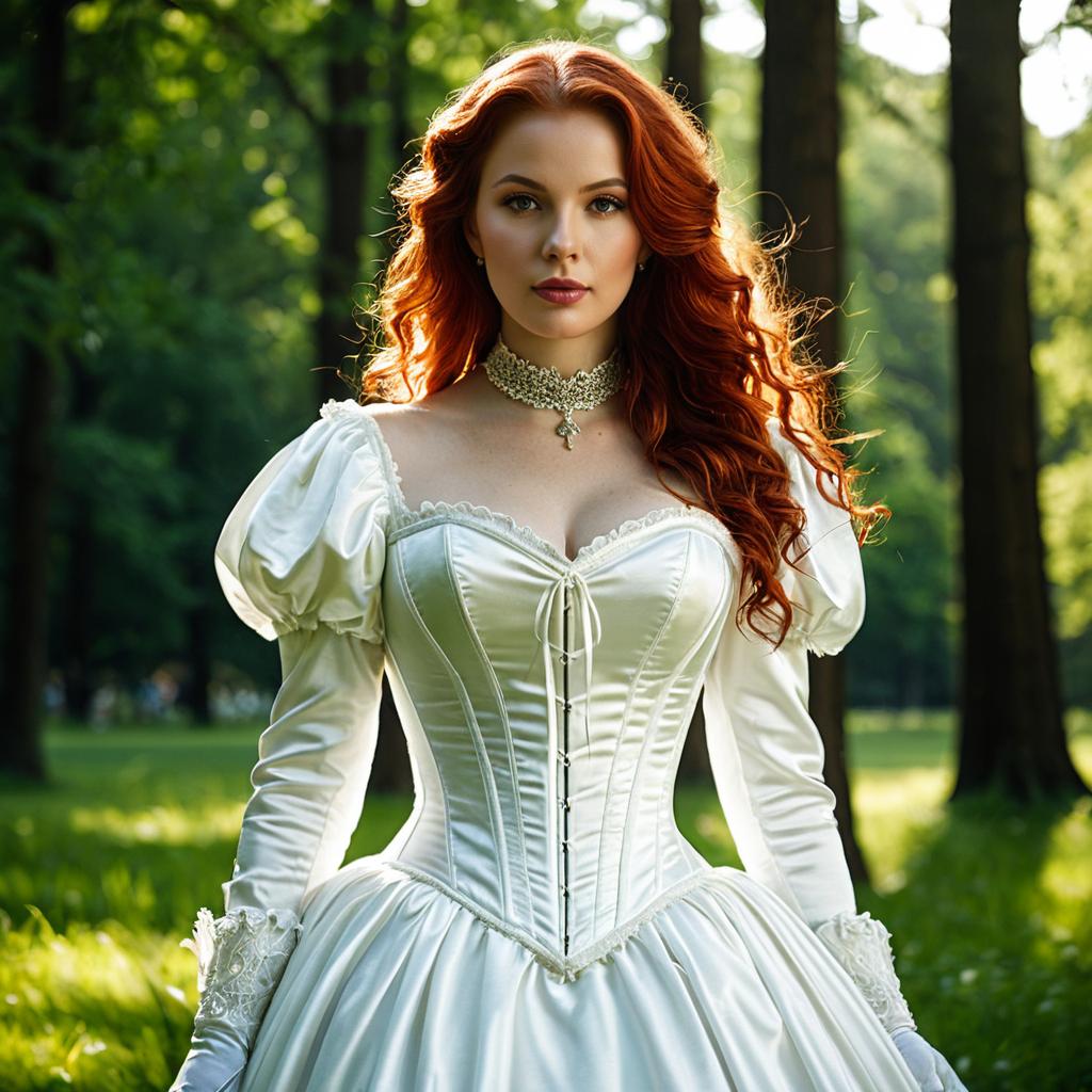 Long white costume gloves, photorealistic, red-haired woman, standing in park, wearing white satin medieval-style dress with corset, long white gloves, choker, soft curls, serious expression, sunlight filtering through trees, green leaves, blurry background, detailed ures on dress, natural light, outdoors, summer, elegant, beautiful, fair skin, realistic, high quality, photography style, romantic atmosphere, background trees and grass, realistic lighting, detailed shadows