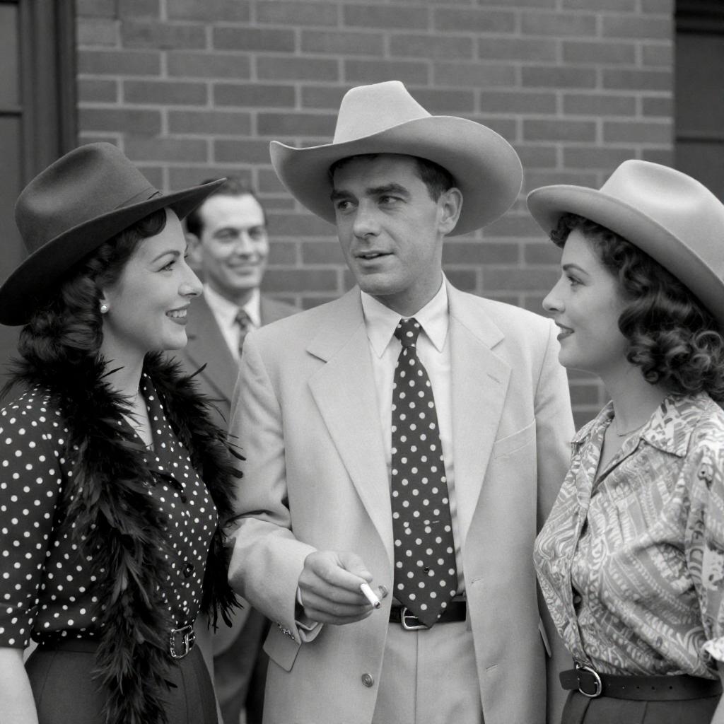 Black and white photograph of three people. Two men and one woman. Woman holds wide-brimmed hat with flowers, wears puffed-sleeve dress. Both men wear hats, dark suits. Men smile at woman, who smiles back. Background includes building sign. Man on right holds hat, stands close to woman. Woman on left holds hat, stands between men. Casual outdoor setting.