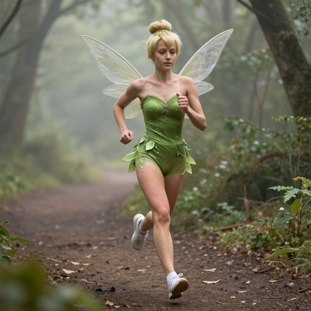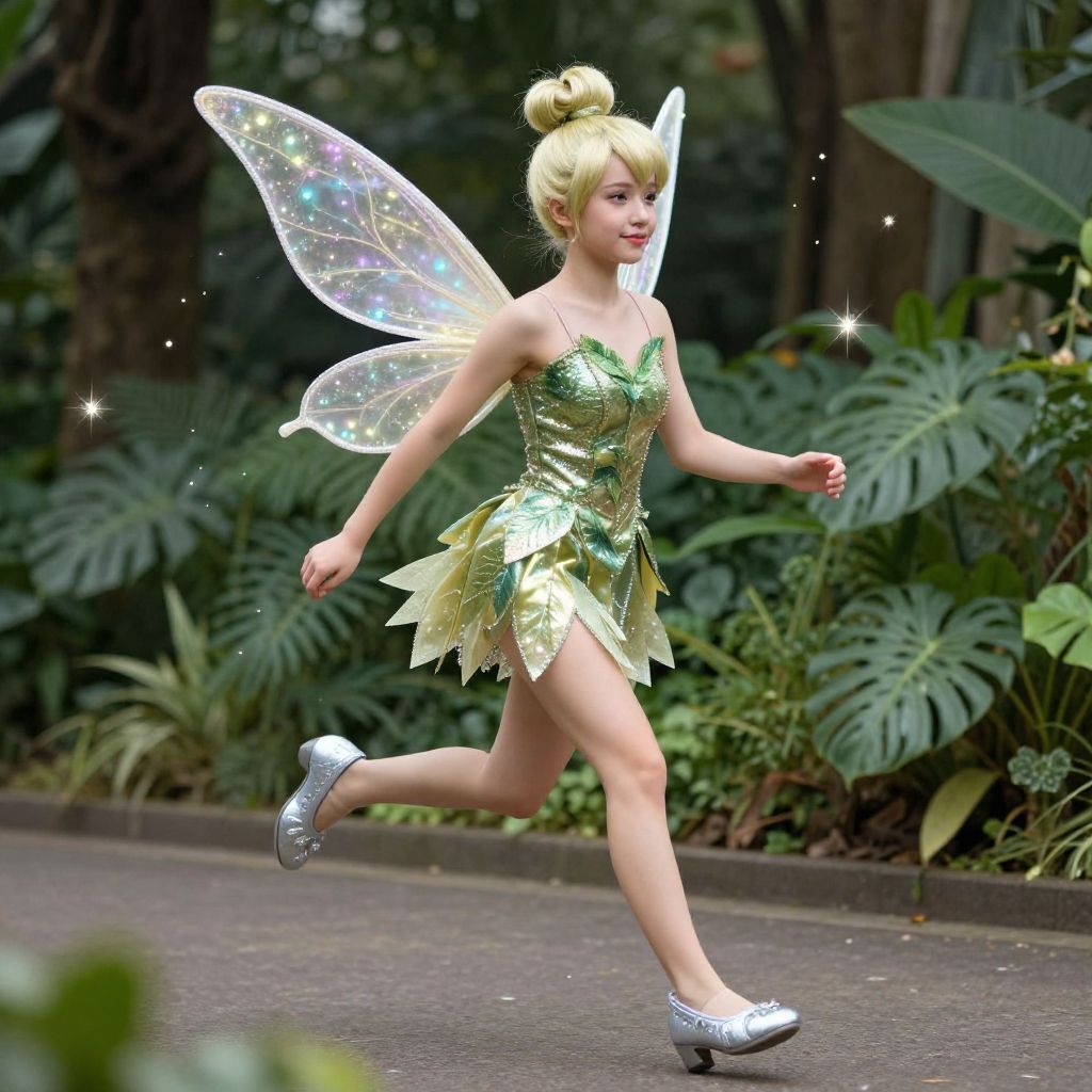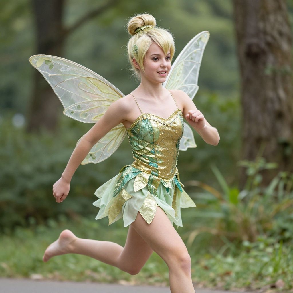 Tinkerbell running costume featuring a sleek, modern fairy design with translucent shimmering wings, glowing accents, and breathable fabric, captured mid-run through a magical woodland trail with sparkles and soft rays of sunlight filtering through trees.