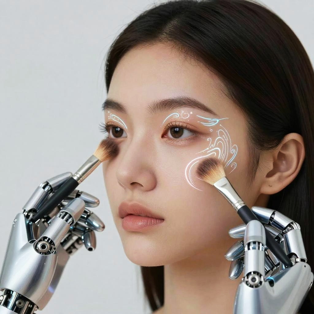 AI makeup design, robotic hands applying glowing makeup on human face, holographic brushes, intricate patterns, mix of natural skin texture and digital enhancements, modern beauty tech innovation, sharp focus, elegant composition