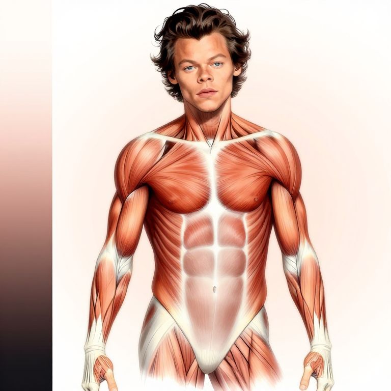 Harry Styles muscle anatomy study illustration, detailed and anatomically accurate muscles of upper body and arms, with soft pastel background, blending fashion and fitness, clean lines and realistic shading, modern graphic art