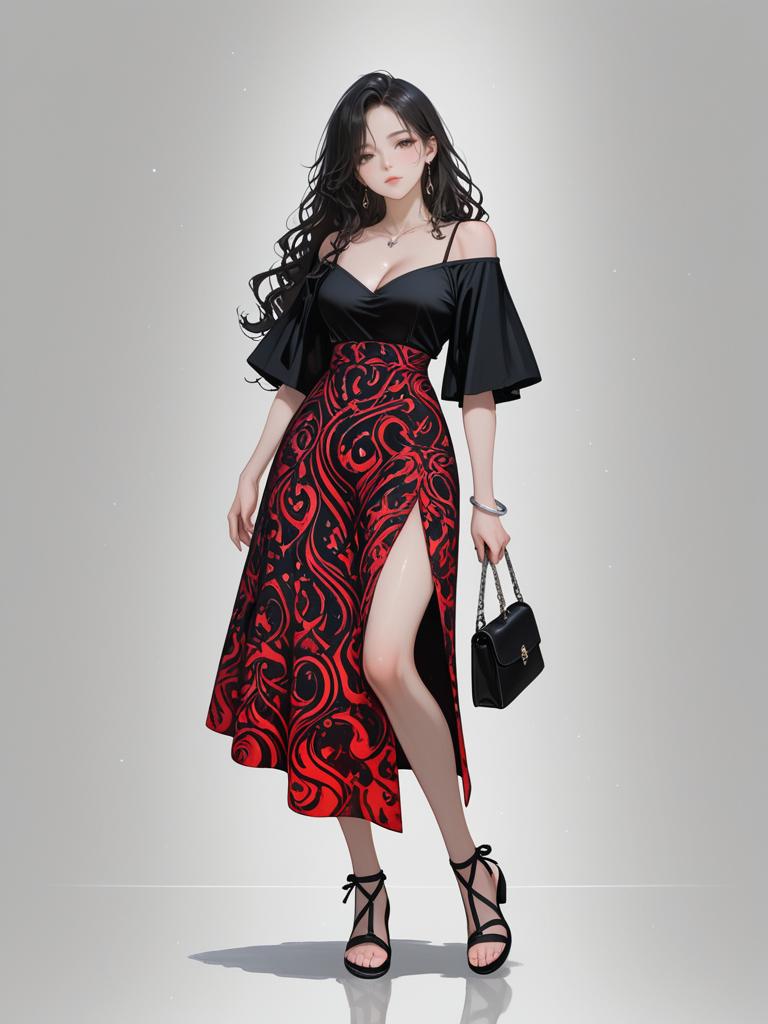 Digital illustration of a young woman with long, wavy black hair and fair skin. She wears a black off-the-shoulder top with short, puffy sleeves and a red and black swirl-patterned, high-slit skirt that reveals her left thigh. She holds a small black handbag in her right hand and wears black strappy high-heeled sandals. Her expression is neutral, and she stands against a simple gray and white gradient background. The overall style is modern and slightly gothic, with a focus on bold colors and patterns.