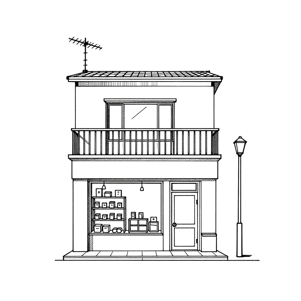 Minimalist line art architectural sketch of a small two-story building with a shop on the ground floor, featuring a window display with shelves of items, a door, a balcony with a window above, an antenna on the roof, street elements including a pole, clear white background, black and white color scheme