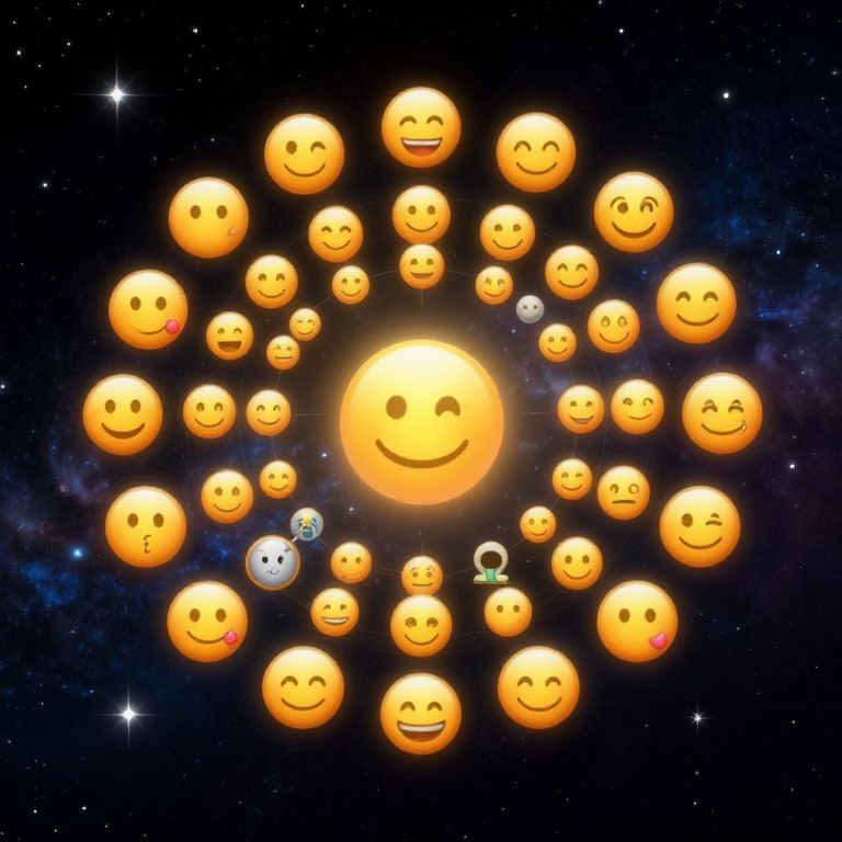 Picture of emojis forming a circular pattern around a glowing center, set against a dark cosmic background filled with stars and galaxies, combining whimsical emotion icons with futuristic themes, symbolizing universal communication and connection.