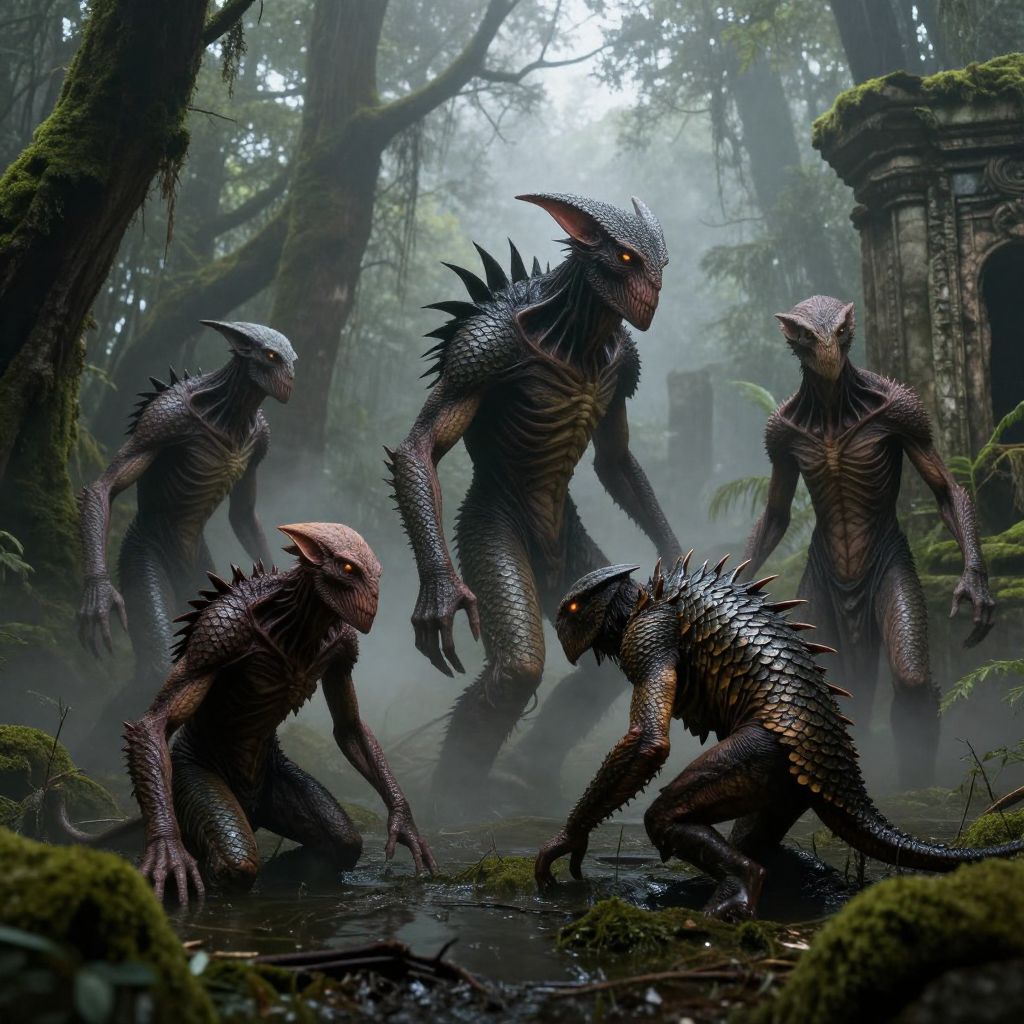 Half human, half animal creatures emerging from a foggy swamp, detailed scales and skin textures, glowing eyes, mysterious and ancient setting, surreal environment with moss-covered trees and ancient ruins, high contrast, dark fantasy mood.