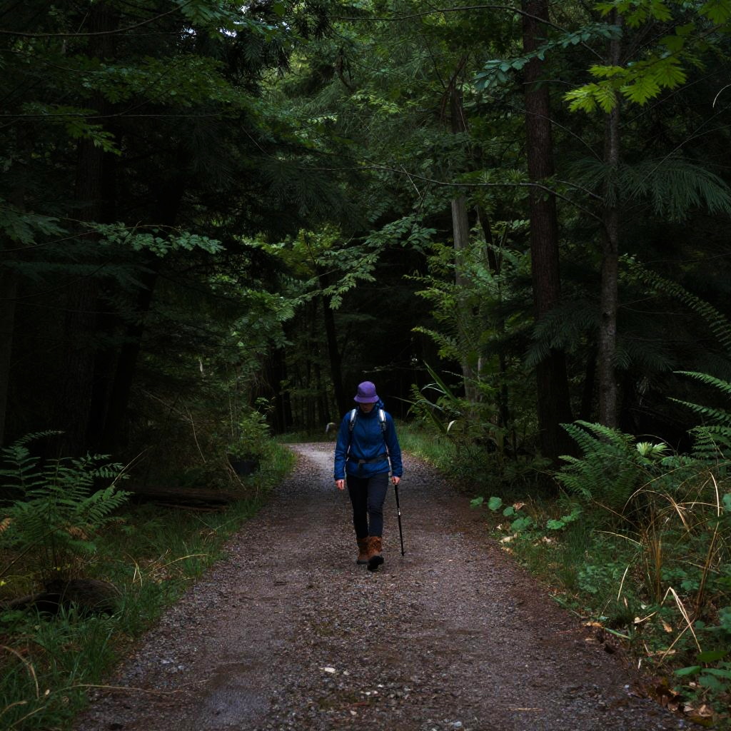 A photograph of a lone hiker with a blue jacket and purple hat walking along a wet, gravel path through a dense, dark forest. The hiker, wearing brown boots, carries a walking stick and is positioned slightly to the left of the center. Tall trees with lush green leaves surround the path, which is illuminated by a subtle light from above.