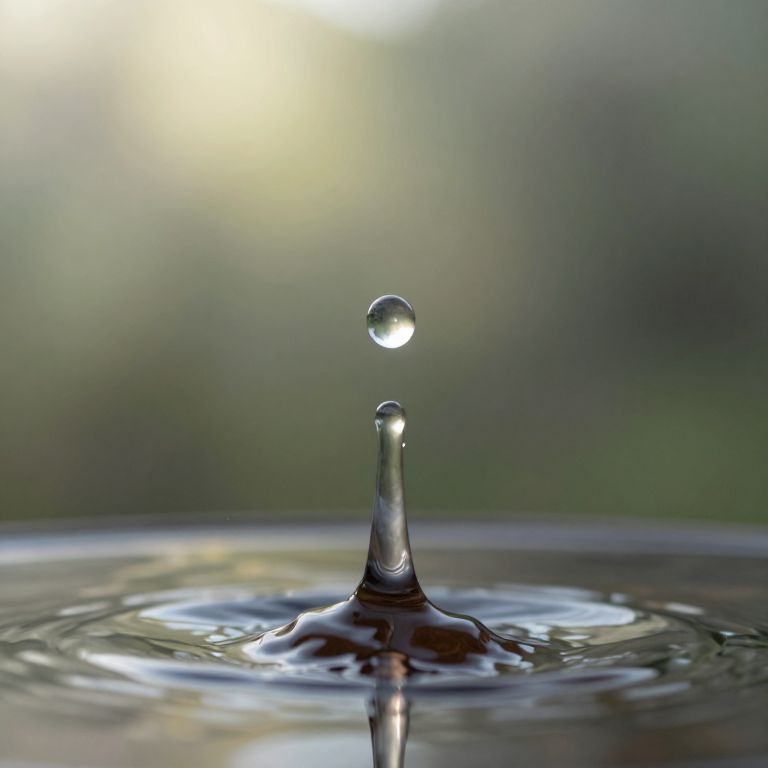 Photograph of a single water droplet mid-air, about to land on a droplet spike in a still water surface, with blurred green and white