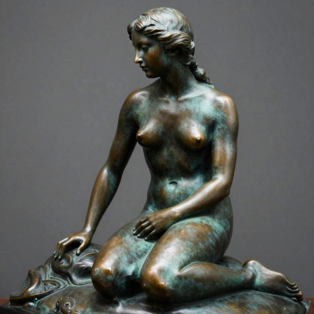 Realistic photo.Detailed photo of an old bronze patina statue of a beautiful seducing mermaid, full body portrait, various seductive poses, photorealism, intricate detail, museum diffuse lighting realistic photo