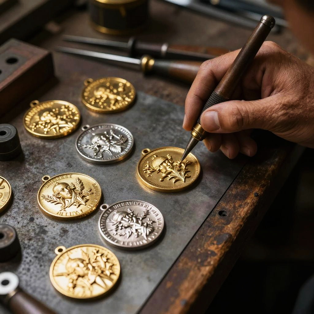 Medal maker at work in a vintage workshop, surrounded by tools and metal sheets, intricate engravings on gold and silver medals, warm lighting highlighting the craftsmanship, photorealistic details, steampunk style