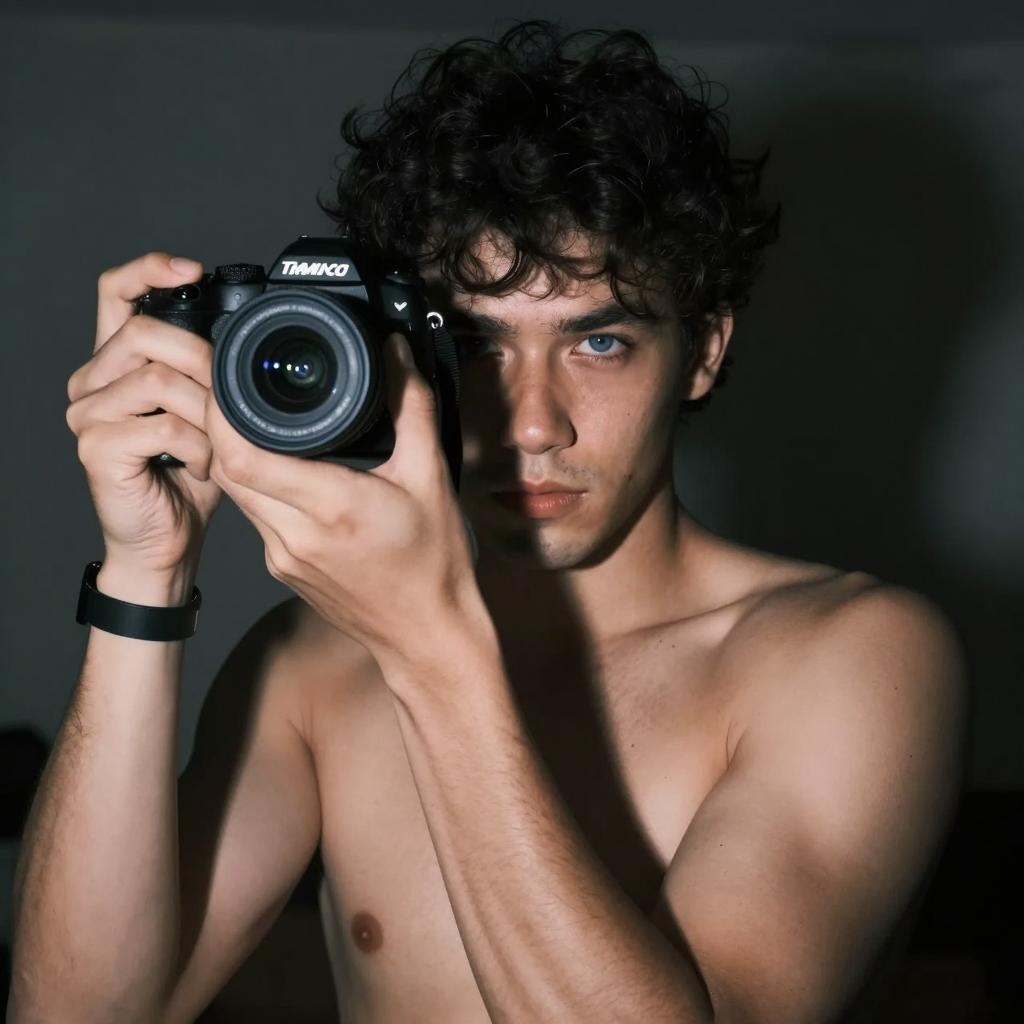 A man with dark, curly hair lying on a blue pillow. His face is slightly flushed, with a neutral expression. He is shirtless, with visible stubble on his chin. The background is out of focus.