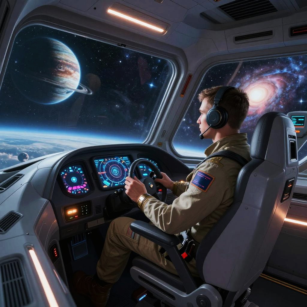 Photorealistic CGI: Astronaut in beige spacesuit with American flag patch, wearing headset, sits in spaceship cockpit, steering, with planets and galaxy