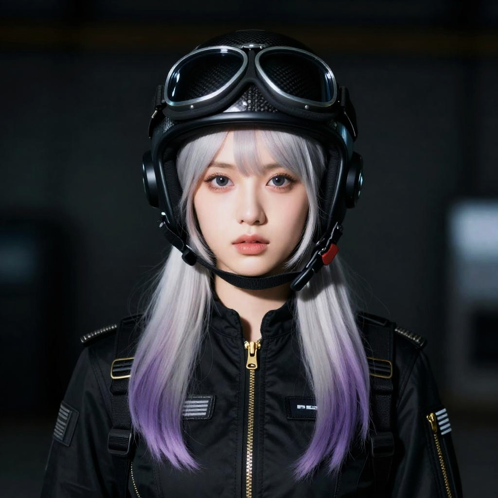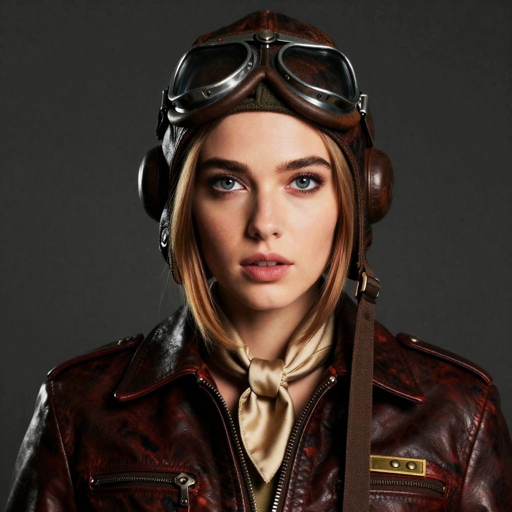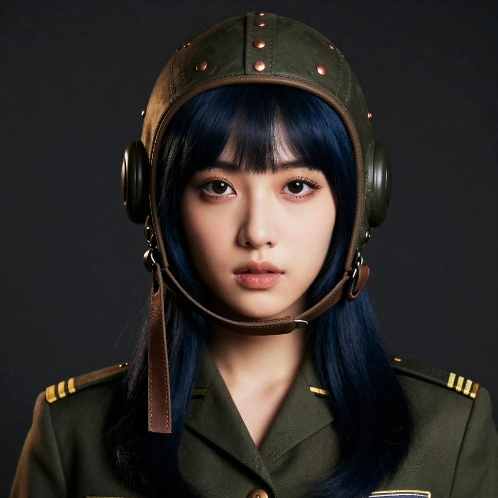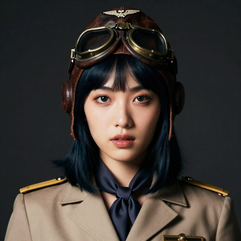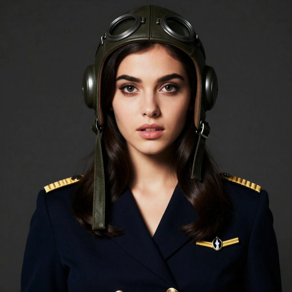 Brash a photograph portrait of a young exquisitely beautiful female pilot gazing directly at you with straight ash gray ombre hair wearing an olive green knitted aviator beanie with large bright eyes and slightly parted lips wearing a naval-style double-breasted pilot uniform with brass buttons. high contrast, cinematic, volumetric lighting,