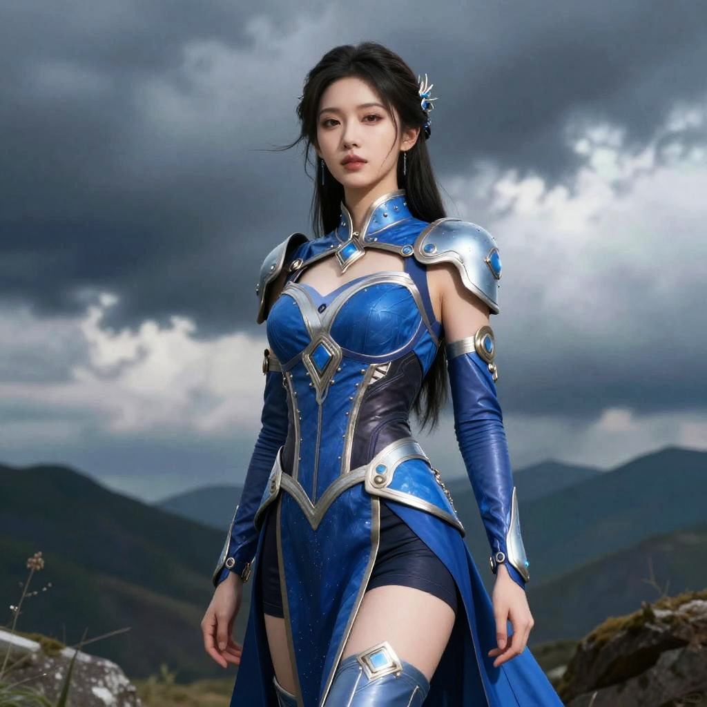 This captivating image features a woman adorned in an intricate, futuristic blue outfit, set against a dramatic landscape filled with dark clouds and distant mountains. The striking color palette and detailed costume design evoke a sense of fantasy and adventure, making the artwork both enchanting and visually stimulating.