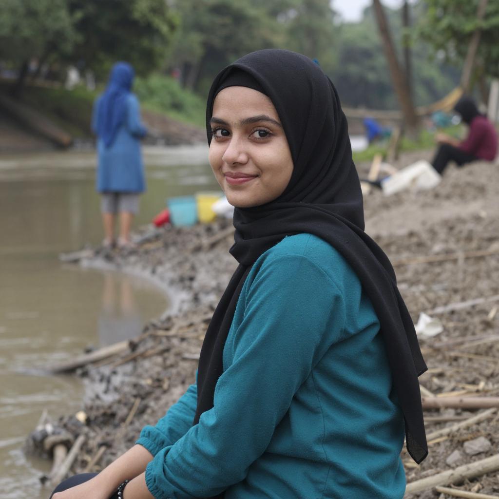 Photograph of a young woman with light skin and dark eyes, wearing a black hijab and teal long-sleeve shirt, sitting on a muddy riverbank. She looks over her shoulder with a slight smile. Background includes blurred trees, a blue-clad person, and scattered objects.