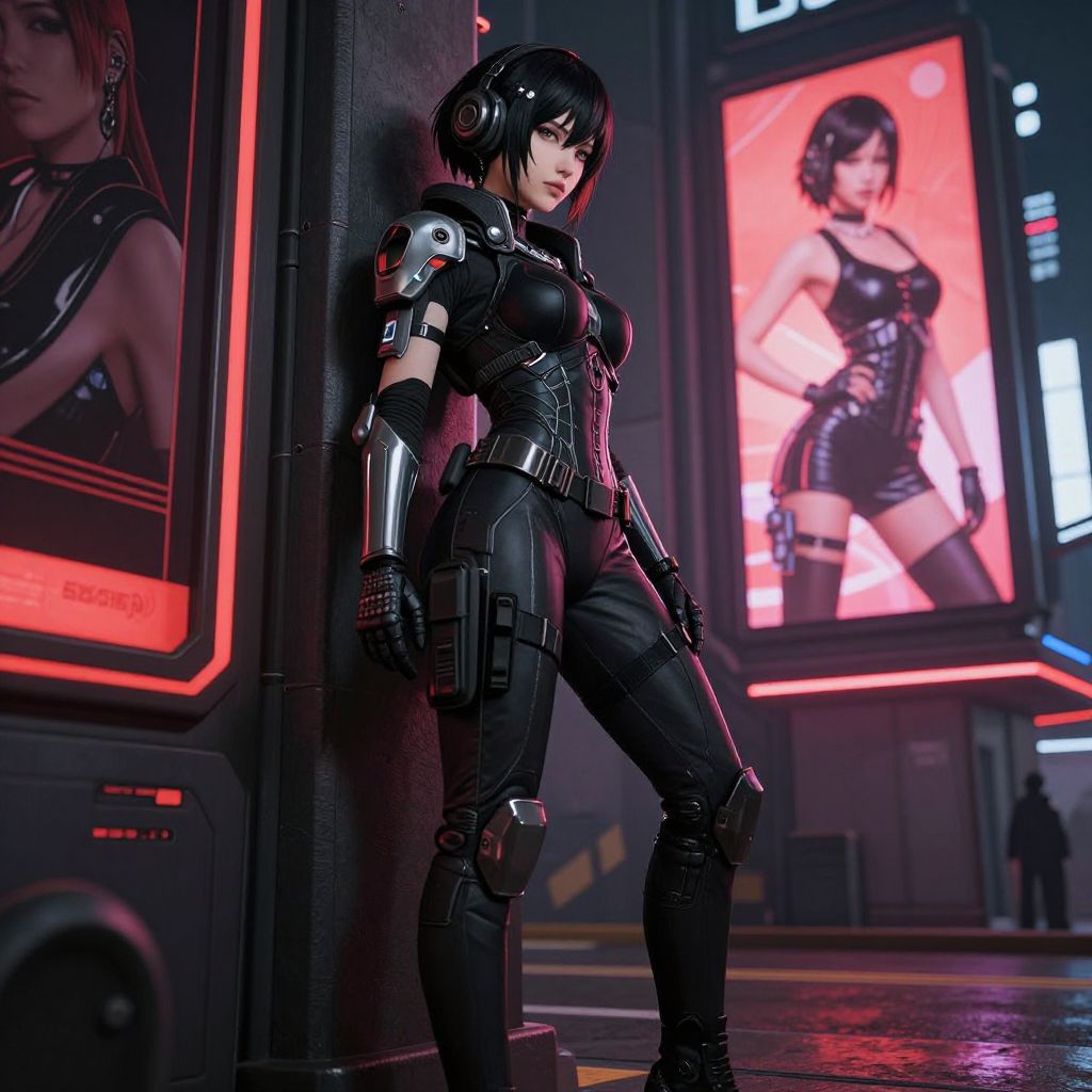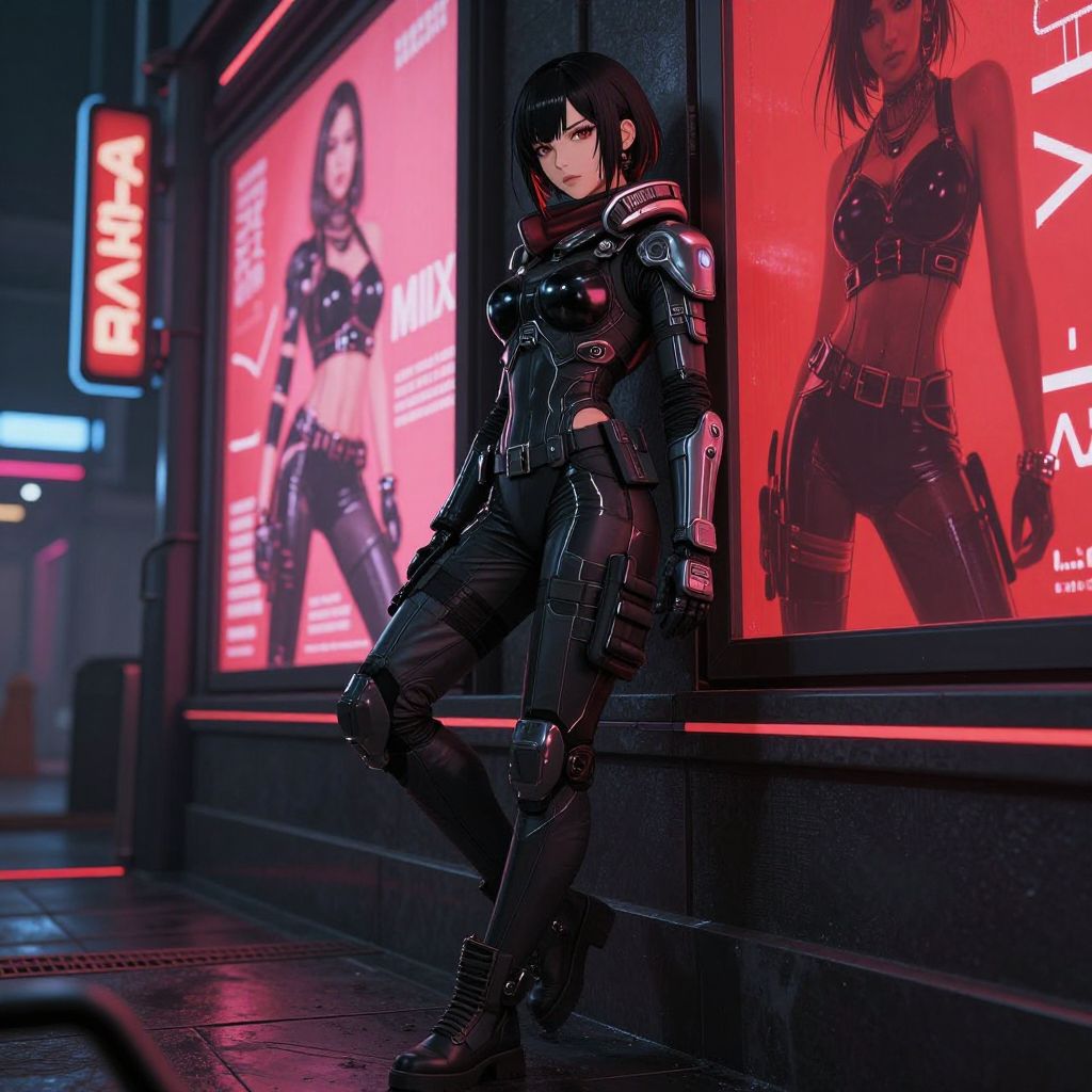 Cyberpunk anime style, sci-fi female soldier in skin-tight battle armour, leaning against a wall on a cyberpunk street, with neon signs and large adverts featuring supermodels, red and black colour theme