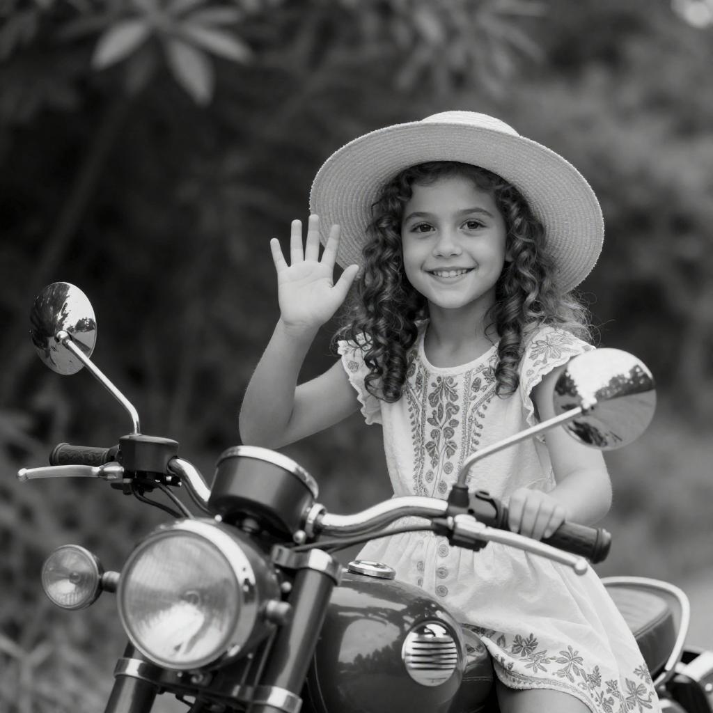Black-and-white photo of a smiling young girl with curly hair wearing a large wide-brimmed hat and an ornate embroidered dress, sitting on a vintage motorcycle. The girl waves her right hand while holding the motorcycle's handlebars. The background is blurred dense foliage.