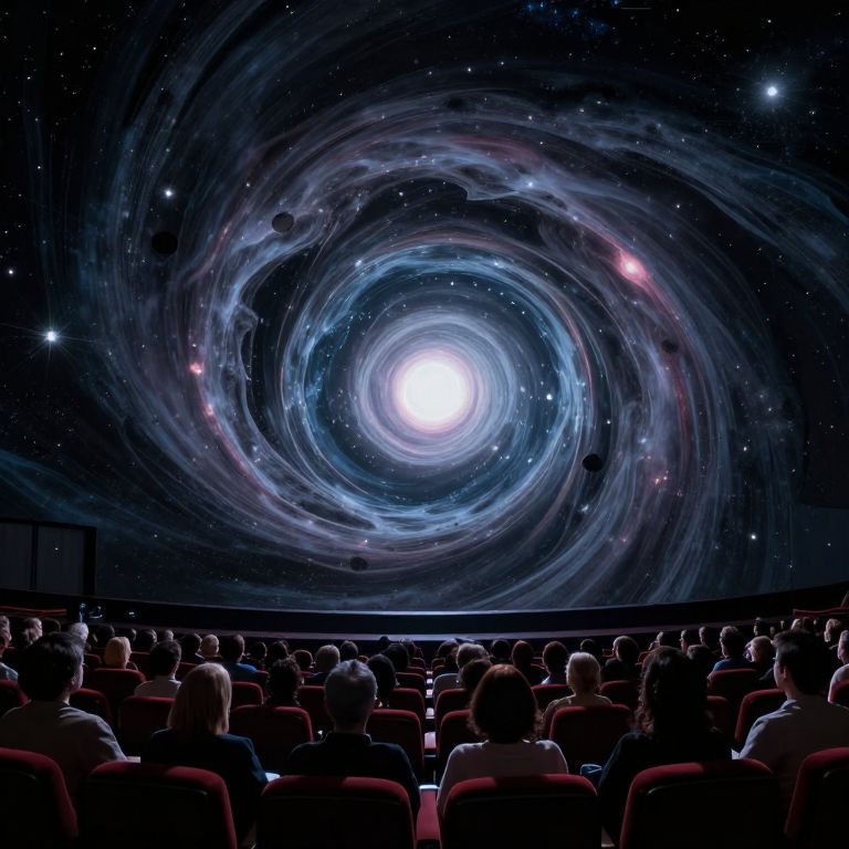 Photograph of a dimly lit theater with an audience facing a large, colorful, swirling galaxy projection on the screen.