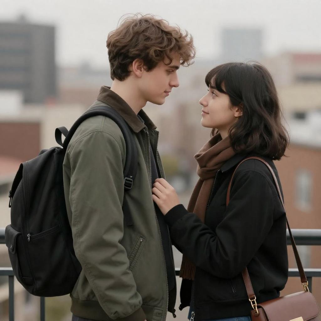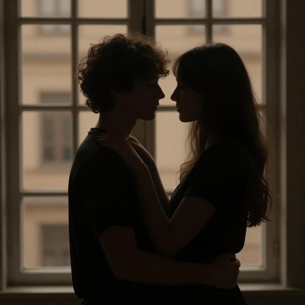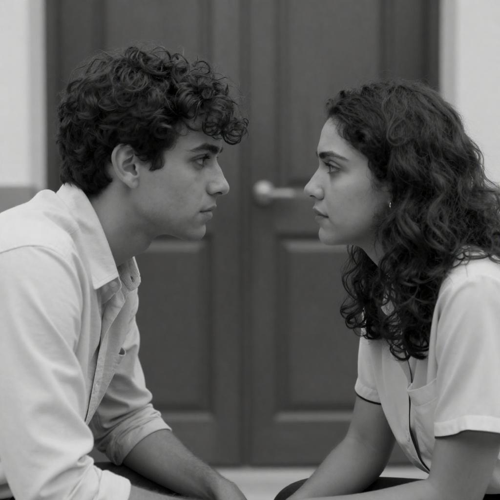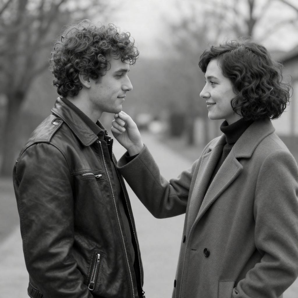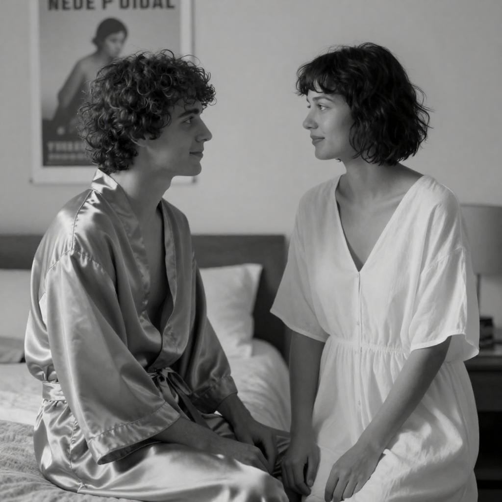 Black and white photograph of a man and a woman in a bedroom. Man with curly hair, wearing a satin robe, sitting on a bed, facing the woman. Woman with short, tousled hair, wearing a white dress, standing beside the bed. Both looking at each other. Poster on the wall behind them. Bed with pillows and blankets. Soft lighting. Man's robe has a shiny ure. Woman's dress is simple and loose. Man and woman interact closely, both smiling slightly.