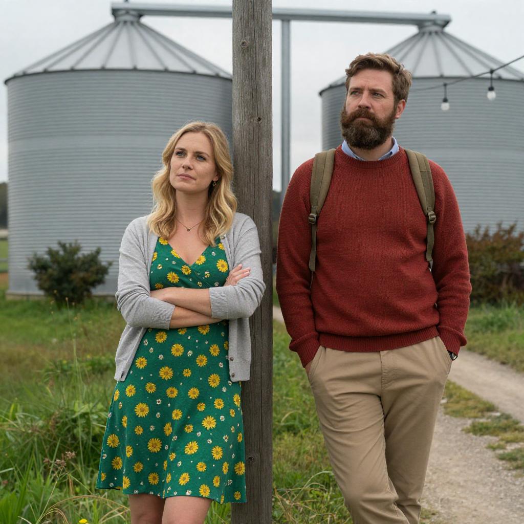 Photograph of two people in a grassy field at dusk. A bearded man with a plaid shirt, red pants, and a stick stands on the left, looking serious. A woman with a brown cap, white tank top, brown overalls, and a blue checkered shirt tied around her waist stands on the right, holding a black object. A full moon is visible in the blue sky. The woman's expression is determined. The man's expression is intense. Both stand with hands on hips.
