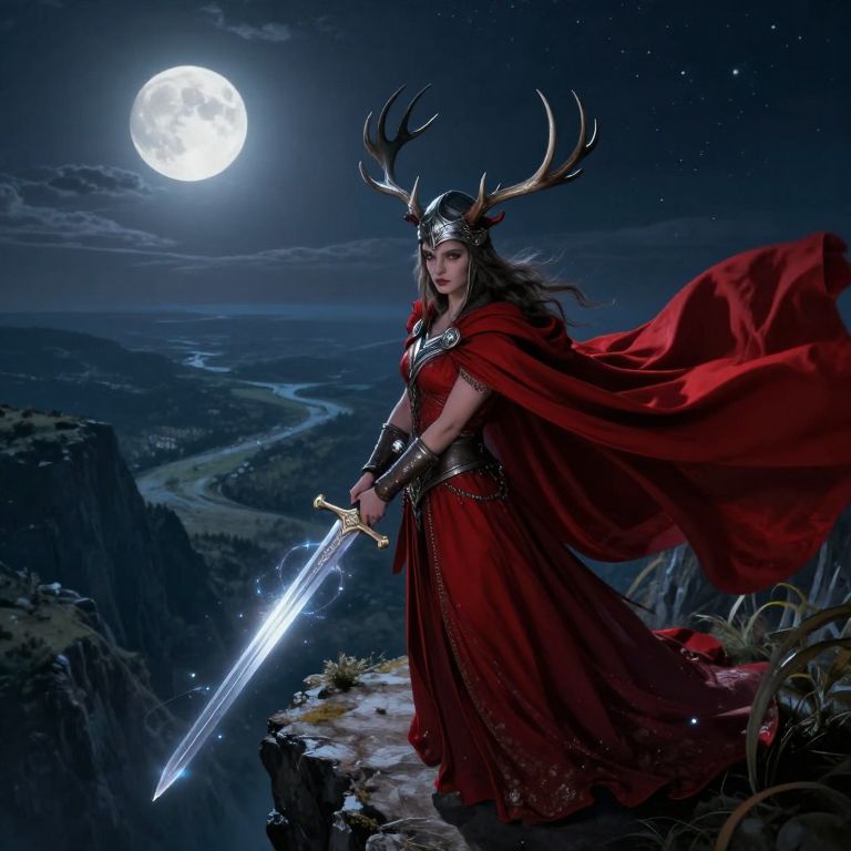 In an enchanting moonlit landscape, a mystical figure emerges from the shadows—a fierce Valkyrie adorned with an antlered helm, her piercing gaze both powerful and compassionate. This scene unfolds from an aerial perspective, revealing her standing on a precipice overlooking a vast valley below, illuminated only by the soft silver glow of the moonlight. Her flowing red cape billows behind her as she clutches an ancient sword, its blade shimmering with celestial energy that seems to pulse in harmony with the rhythm of her heartbeat. This captivating image weaves together elements of medieval legend and fantastical lore, evoking a sense of awe and reverence for the enigmatic figure who stands at the threshold between realms, her presence both a beacon of hope and a harbinger of destiny. The style captures an ethereal essence reminiscent of Waterhouse's paintings, with a focus on intricate detail and atmospheric lighting to create a mesmerizing tableau that transports the viewer into this enchanting world.