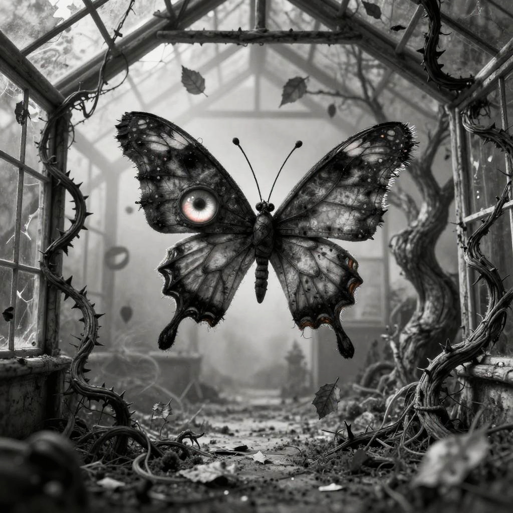 Ethereal ink and watercolor wash with bleeds and fades, featuring luminous moth with wispy antennae and tattered wings in crumbling gothic greenhouse overrun by thorny vines and pale flowers; dramatic chiaroscuro lighting casting warped, elongated shadows, off-kilter perspective, surreal and gothic ambiance, high-detail linework, textured brushwork, muted moody palette.