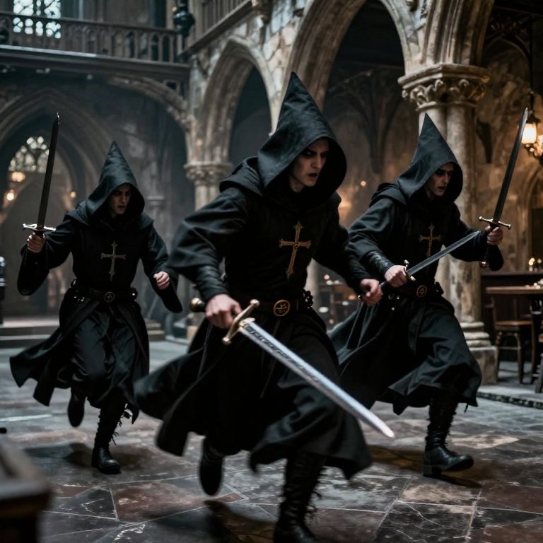 In this dynamic, action-packed scene, three gothic cultists sprint through the ruins of a medieval tavern, their robes billowing and pointed hoods casting shadows on their faces. The motion blur captures the urgency and chaos of their movement, emphasizing the speed and intensity of their run. Each cultist wields a mixed sword and dagger, their engraved crosses adding a sense of mysticism and purpose to their attire. The interior of the tavern, with its intricate details and depth of field, creates a sense of immersion and tension. The camera lens, at 100mm, focuses on the cultists, blurring the background and emphasizing the action. The overall composition, with its Dutch tilt and grainy texture, enhances the dramatic effect, transporting the viewer into the heart of this medieval conflict.