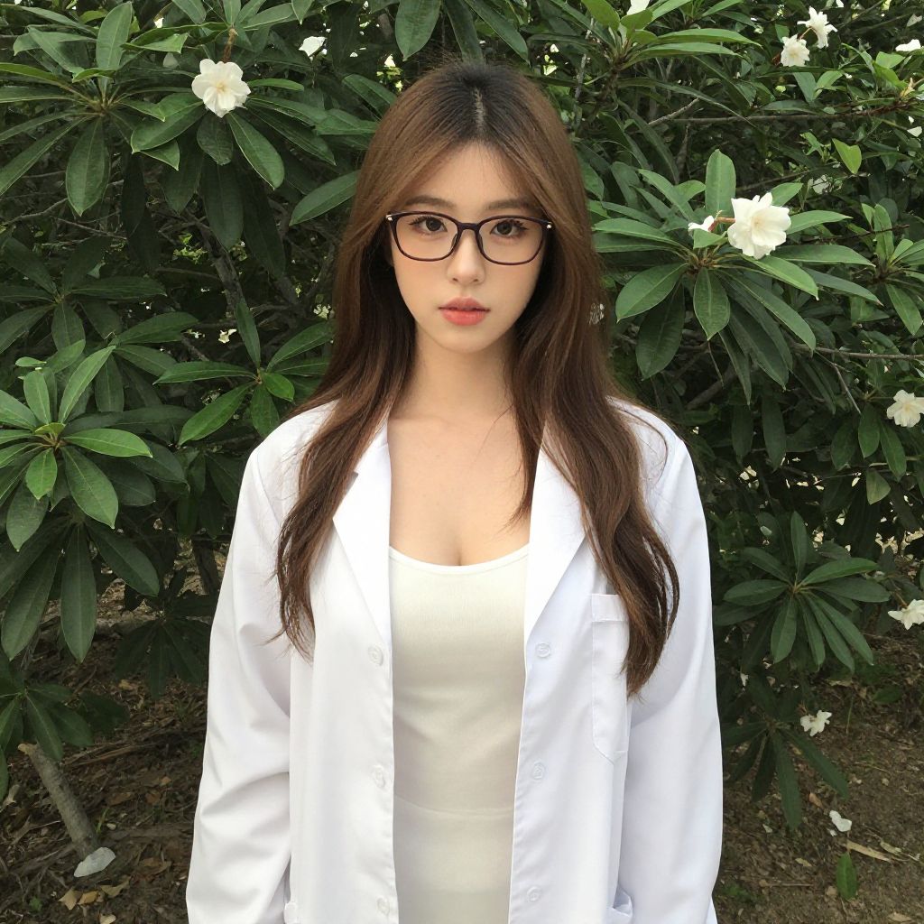 Photograph of an Asian woman with long black hair, fair skin, and brown eyes, standing against a plain white wall. She wears a white nurse's uniform with a short-sleeved button-up shirt and a matching white nurse's cap. Her hands are in her pockets. To the left, a small lit candle in a glass holder is on a dark wooden surface. To the right, a white pump bottle and a small container are also on the surface. The image has a realistic, slightly soft-focus style.