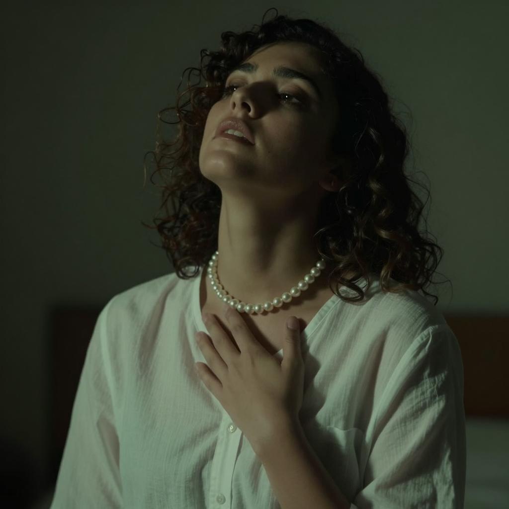 Photograph of a hand with white gauze bandages wrapped around the wrist and fingers, resting on a white, floral-patterned fabric. The hand has short, dark red painted nails. The background is a softly lit, ured fabric. The lighting is cool and dim.