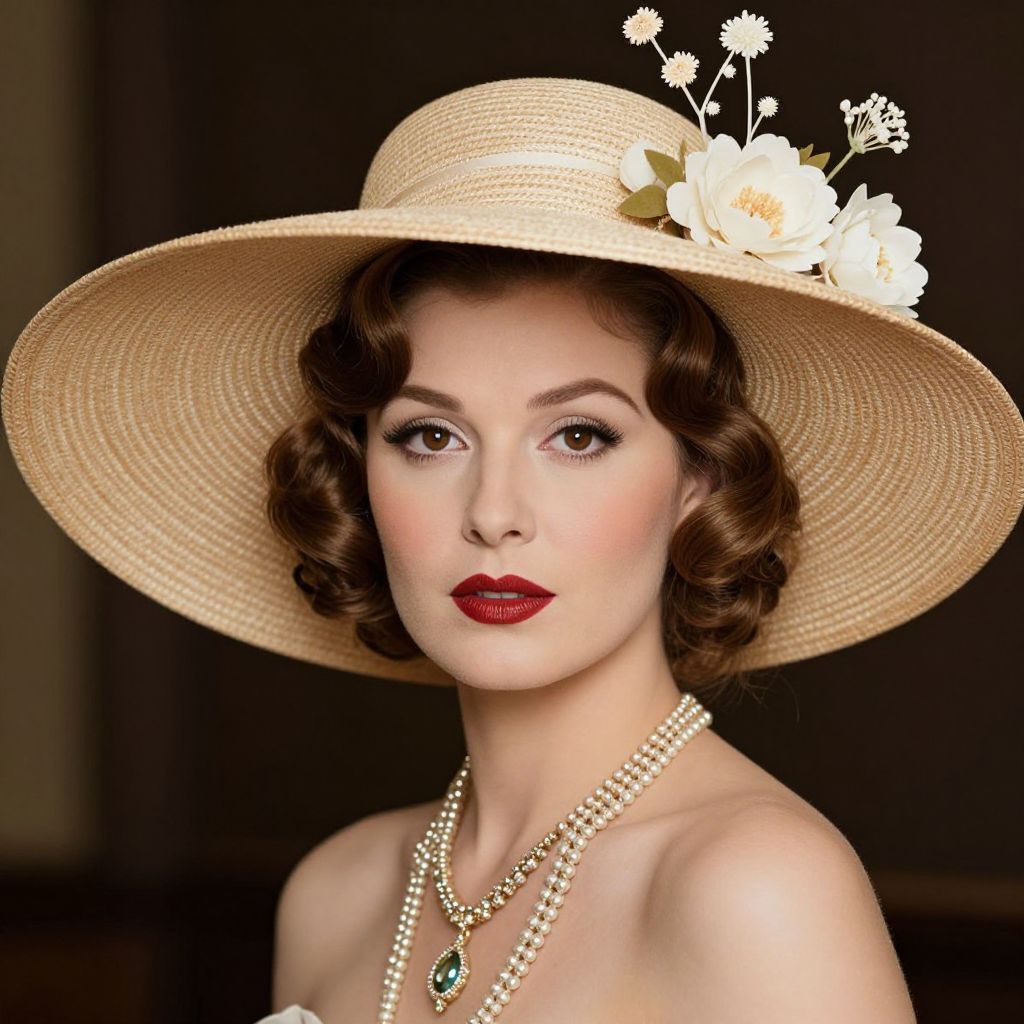 Elegant vintage portrait featuring a woman adorned with a wide-brimmed straw hat embellished with delicate white flowers, styled hair in classic waves, bold makeup, and a shimmering necklace, evoking the glamour of the 1920s era.