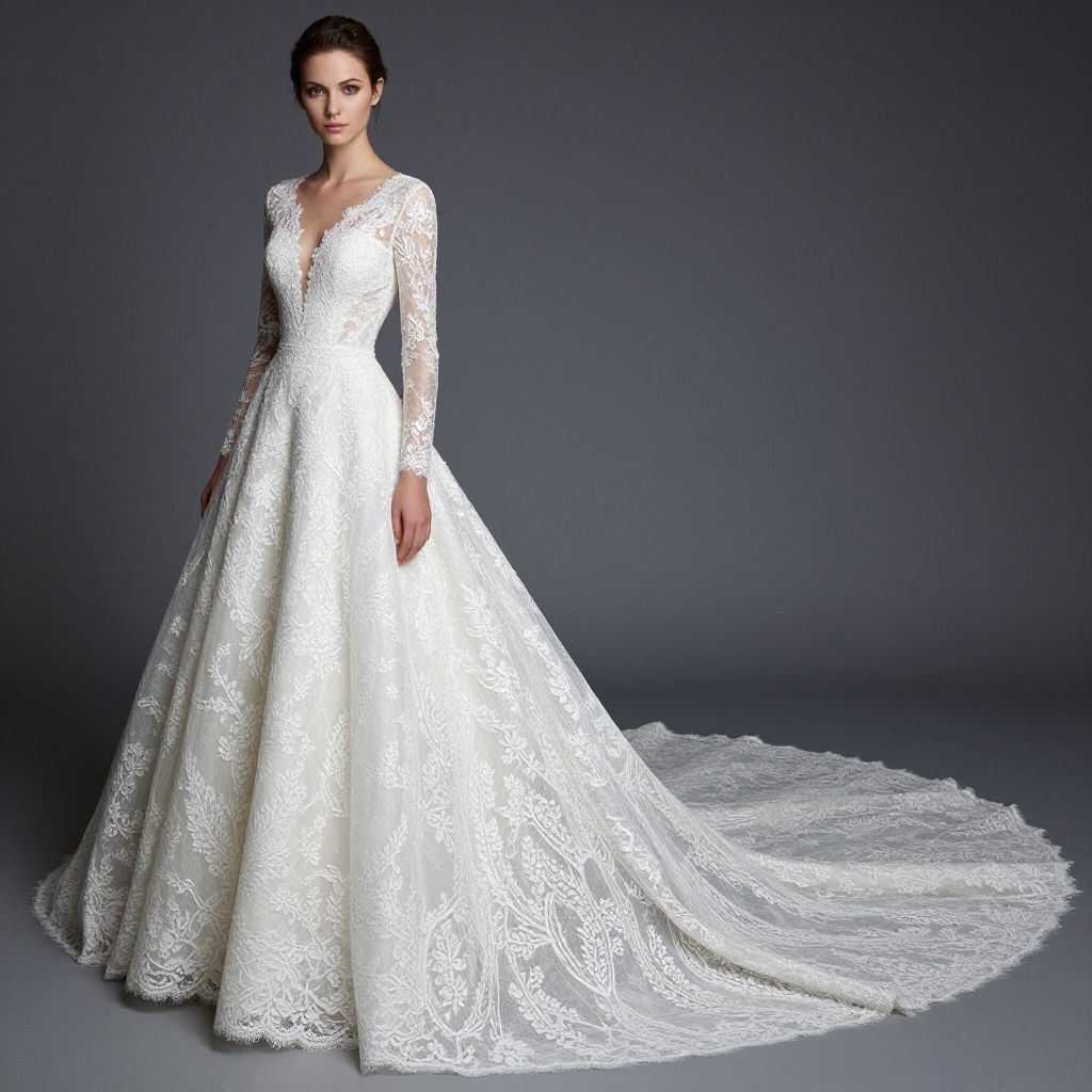 Photograph of a slender, fair-skinned woman with dark, slicked-back hair, wearing an elegant, long-sleeved white lace wedding dress with a deep V-neck and a floor-length, trailing train. The intricate lace pattern covers the entire dress, creating a delicate, floral texture. She stands against a solid, dark gray background, emphasizing the dress's brightness. Her expression is neutral, and her pose is slightly turned to the side, showcasing the dress's full length and detail. The lighting is even, highlighting the lace's texture and the dress's elegant design.