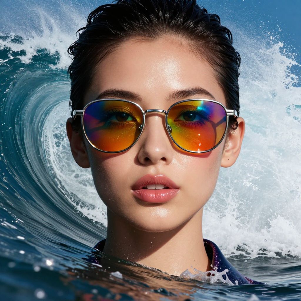 A striking close-up of a stylish and stunning woman with mirrored glasses that reflect a kaleidoscope of vibrant colors, her features illuminated with a glossy, lacquered finish, The composition blends hyper-realism with an avant-garde, glamorous aesthetic, as if captured during a high-fashion photoshoot, A double-exposure effect overlays her against the image of a colossal wave crashing toward the viewer, its motion dynamic and powerful, as seen from a dramatic low-angle perspective, The underground poster vibe enhances the artistic tension, with bold contrasts, vivid hues, and intricate hyper-detailed textures that make the scene come alive