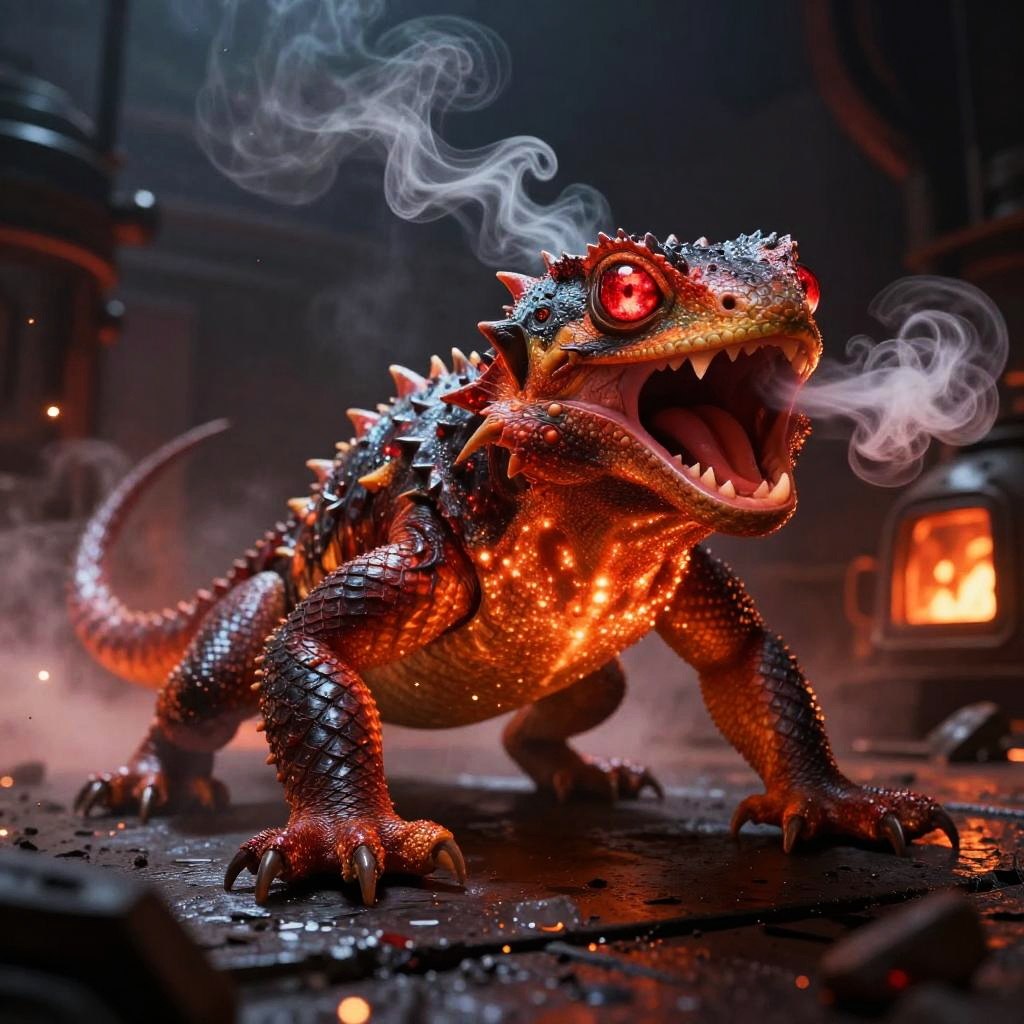 Ember-lizard creature with ruby-like glowing eyes and smoke drifting from nostrils, barreling forward with a blazing roar, industrial furnace room filled with hot embers and steam, action shot, skin pores, very dark lighting, heavy shadows, detailed face, vibrant, photorealistic, dramatic, sharp focus, 8k, (intricate:1.4), decadent, (highly detailed:1.4), digital painting, concept art, octane render, artstation, smooth illustration, global illumination, studio light, volumetric light, atmospheric fog, particles floating, embers, wet surfaces, rim light, depth of field