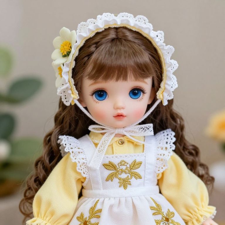 A doll with a yellow outfit and a white bonnet with a flower on it. The doll has blue eyes and is wearing a white dress with gold embroidery.