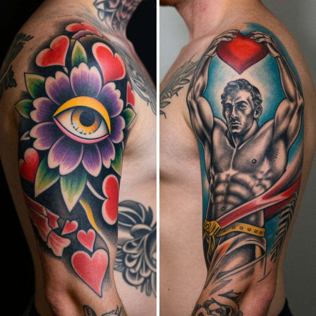 This split-image shows two close-up photos of heavily tattooed torsos. The left side features vibrant, colorful tattoos with a large yellow eye, purple flower, and red hearts on a dark background. The right side showcases detailed, black-and-gray tattoos of a muscular man lifting a heart-shaped object, with bright red and blue accents. Both images highlight the intricate, bold designs and the person's smooth skin.