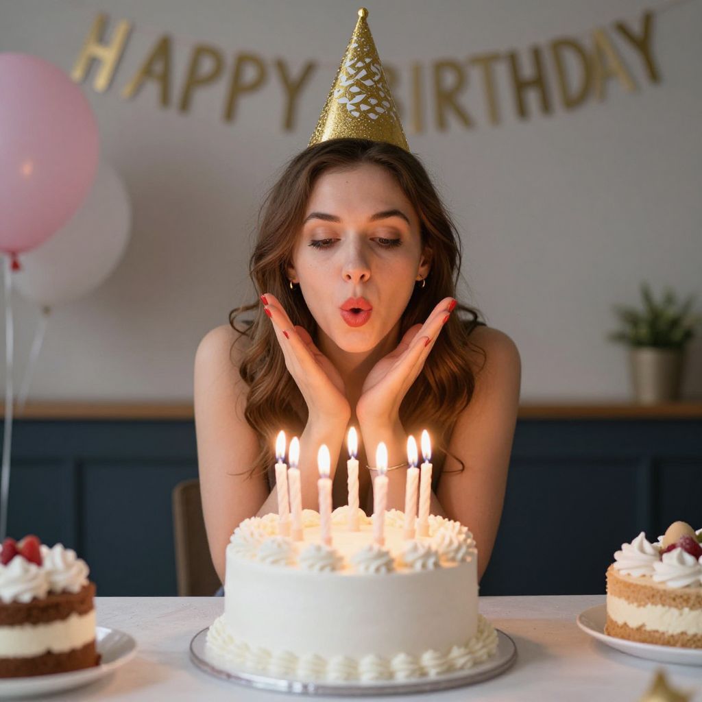Photograph of a young woman with wavy brown hair, wearing a gold party hat, blowing a kiss at a candlelit birthday cake. Background: