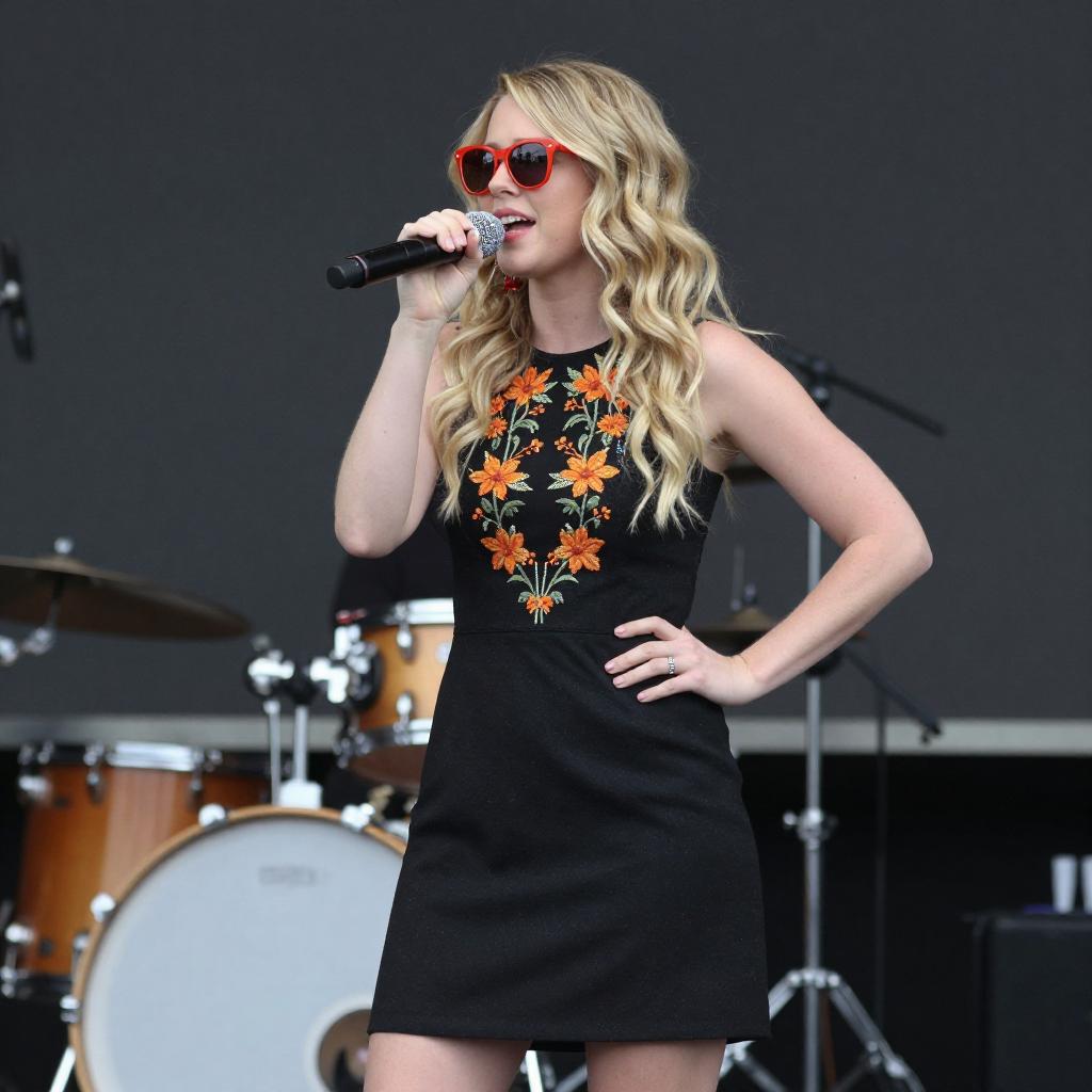 Photograph of a blonde woman with wavy hair singing into a microphone on stage. She wears a shiny, sequined, long-sleeve top and camouflage pants. A drummer is partially visible in the background, with a drum set and guitar on stage. The stage is dimly lit with a spotlight on the singer.