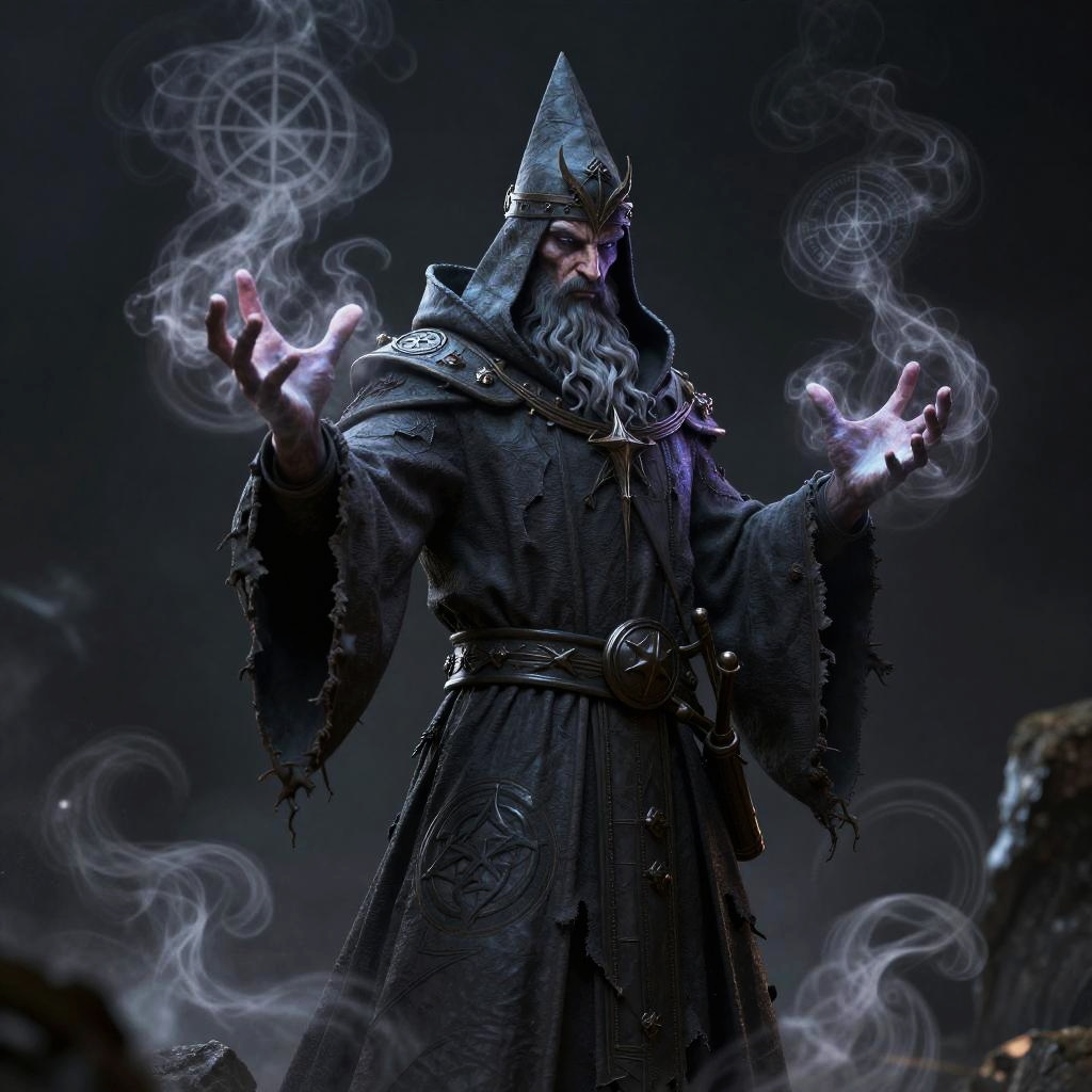 A necromancer pulsing with necrotic energy, inspired by W. H. Hodgson, flickering violet auras, witchcraft sigils, tattered cloth robes, Substance 3D Painter textures, cinematic hyper-realism, Octane Render, Unreal Engine, 8k resolution, high contrast, depth of field, f/2 aperture